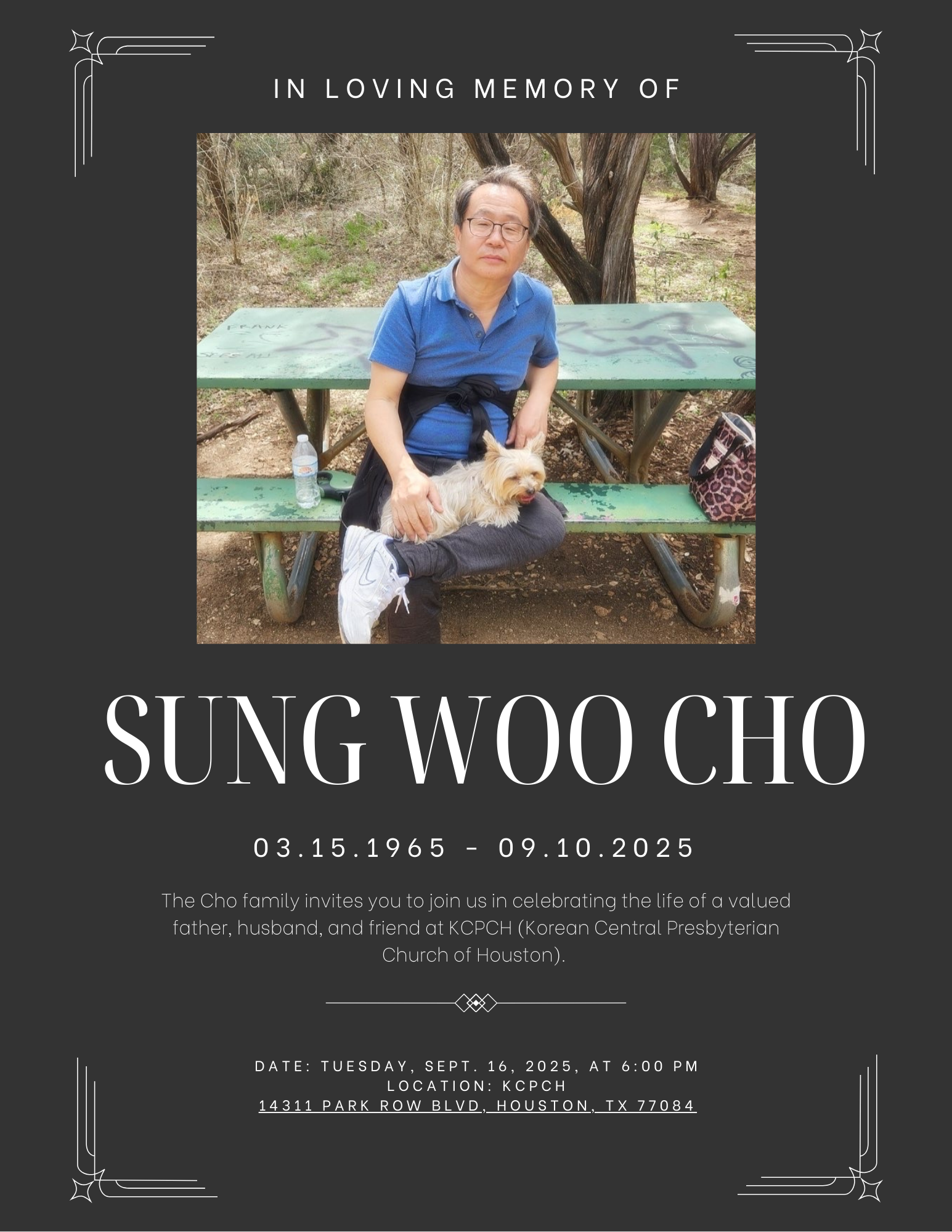 The funeral is set to take place on Sept 16 at 6pm, in our local church in Houston, TX (KCPCH). We’ll have more information that I can share with you all as it gets closer to the date, but I hope the people that got to meet him can come by ❤️‍.