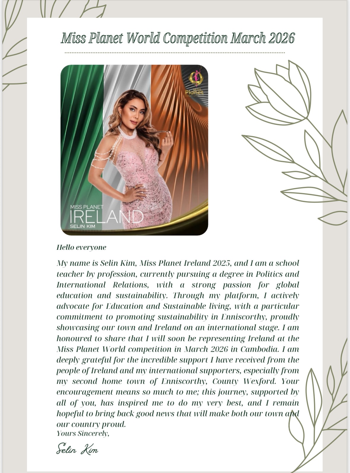 I’m Selin Kim, Miss Planet Ireland 2025, and an advocate for Education and Sustainability (SDGs). I am fundraising to support my two-week journey to represent Ireland at Miss Planet International in Cambodia. With your support would mean a lot, and I hope to bring pride and positive news back to Ireland.