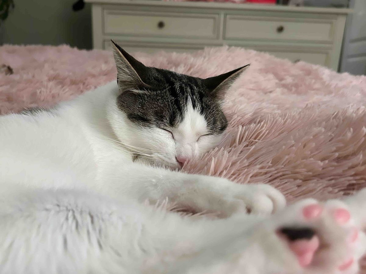 This little girl is so sweet. She sits curled up to my hip every night while I read. She puts her paw on my cheek and kisses me every day. She taps me when she needs love. She is tiny and adorable.