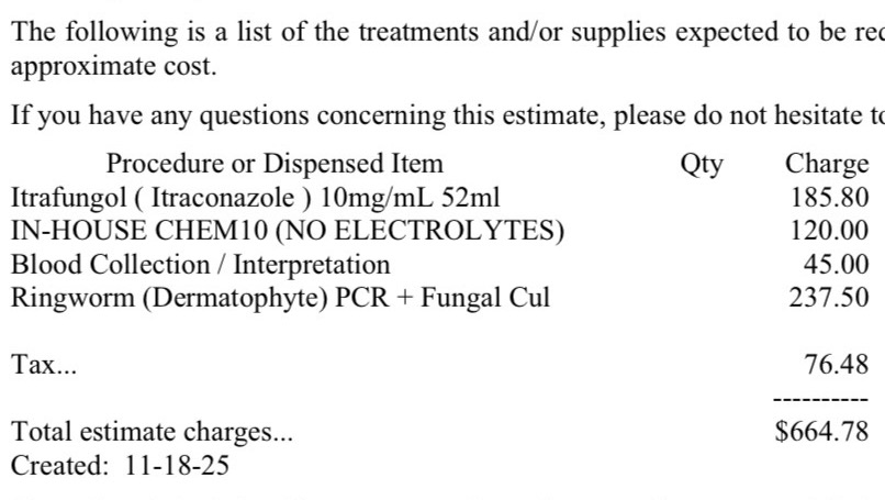 I knew I was in trouble. The full six-week treatment—which includes the expensive oral meds (Itraconazole) plus the two super important final tests to confirm he's actually cured—is going to cost $664.78. When you add the consultation and the first examination fee, the total cost already hits $973.15.