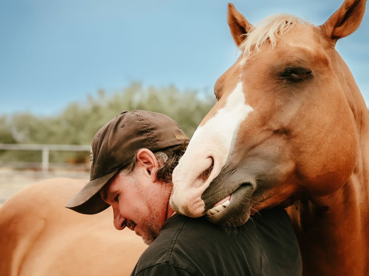 Karen asked Mike if he wanted a stallion. With lots of mares at Equine Voices, she could not take Sunny. Mike said, "Yes!" You can see from the photo how much Sunny loves Mike. Mike loves Sunny right back.