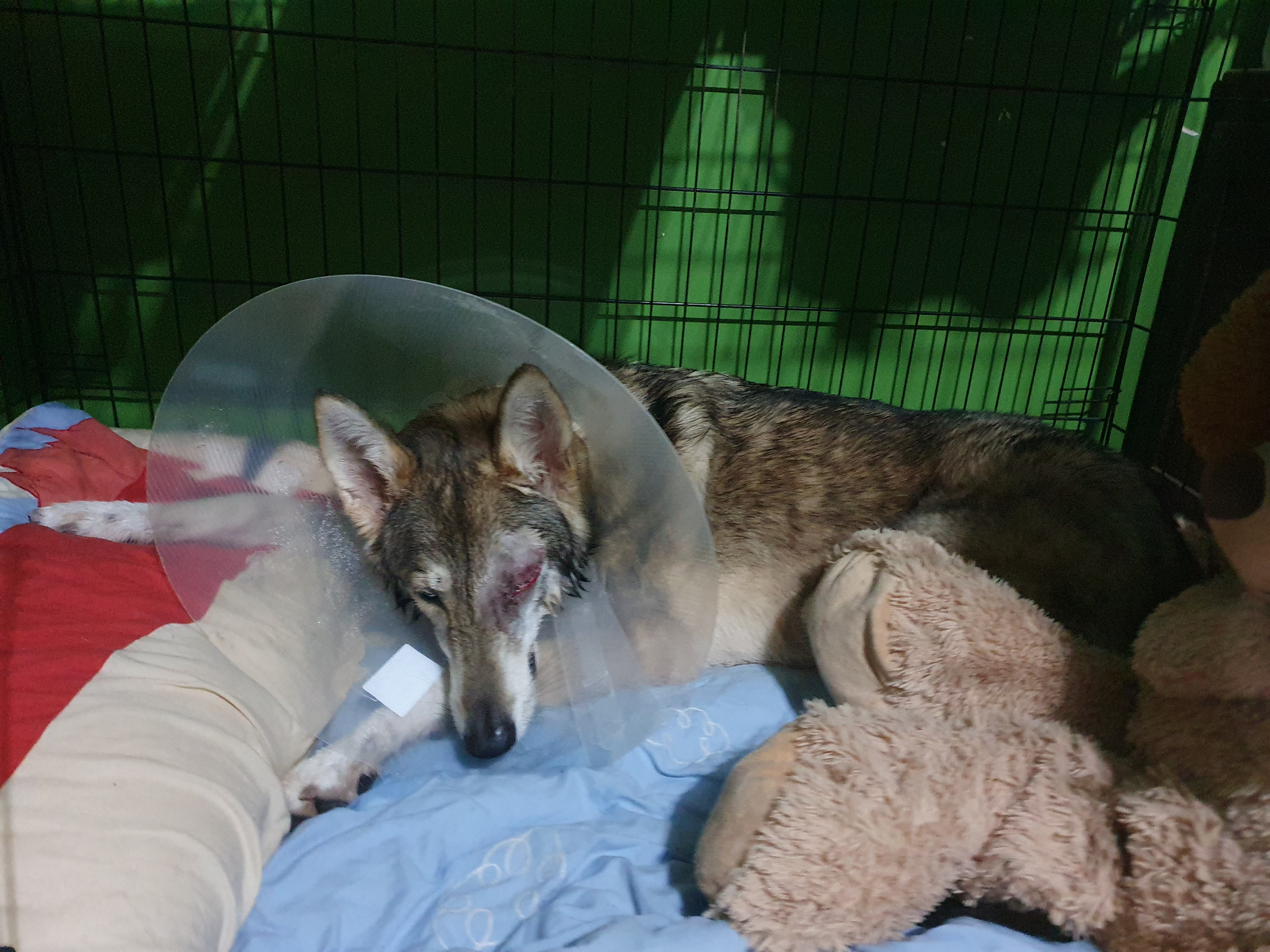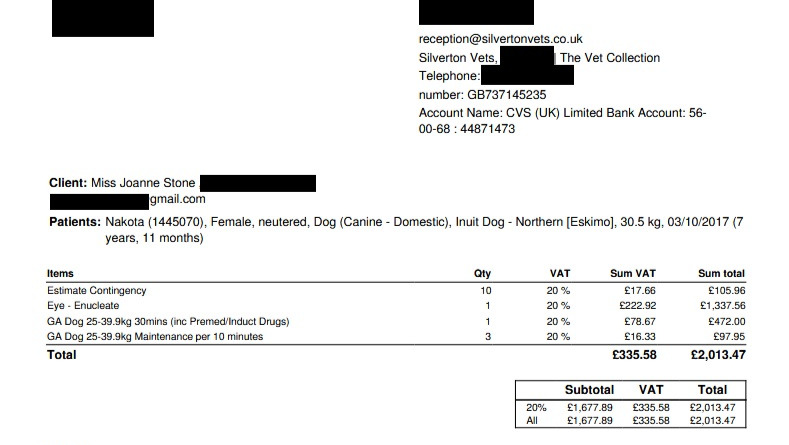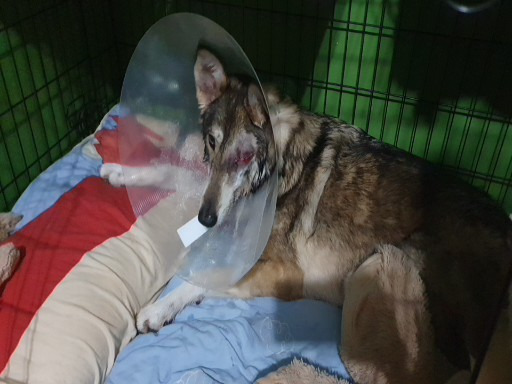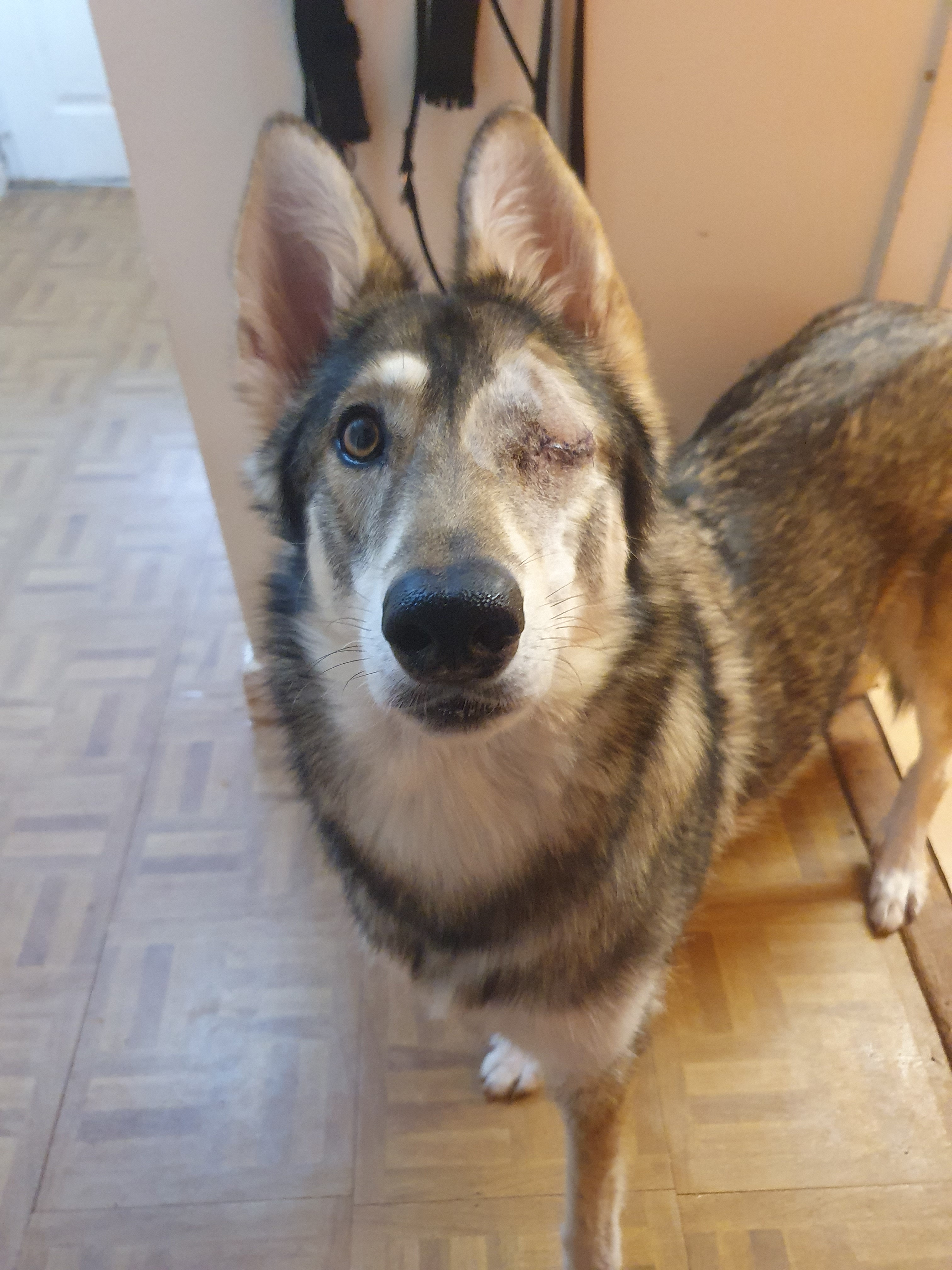 Hi, I am Jo, Nakota my Northern Inuit has glaucoma in her remaining eye. She has has one eye removed already due to a severe glaucoma caused by trauma (Long story and happy to share at a later date). Unfortunately her remaining eye now has glaucoma, the lense has slipped badly giving her about 10/20% vision but with this comes a severe amount of pain. Nakota is on pain relief and eye pressure drops to help her cope better with the pain until she has surgery.