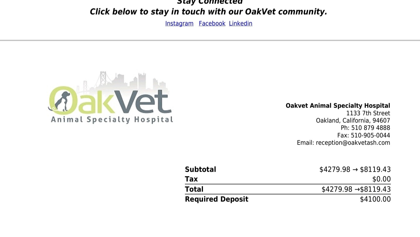 We had held off on pet insurance for years, hoping that an incident like this would never happen. We signed up for insurance on the day of her admission, but the policy has a waiting period and will not provide coverage. Bills are racking up. The initial estimate was ~$8110 and will likely be much more as her hospitalization is ongoing.