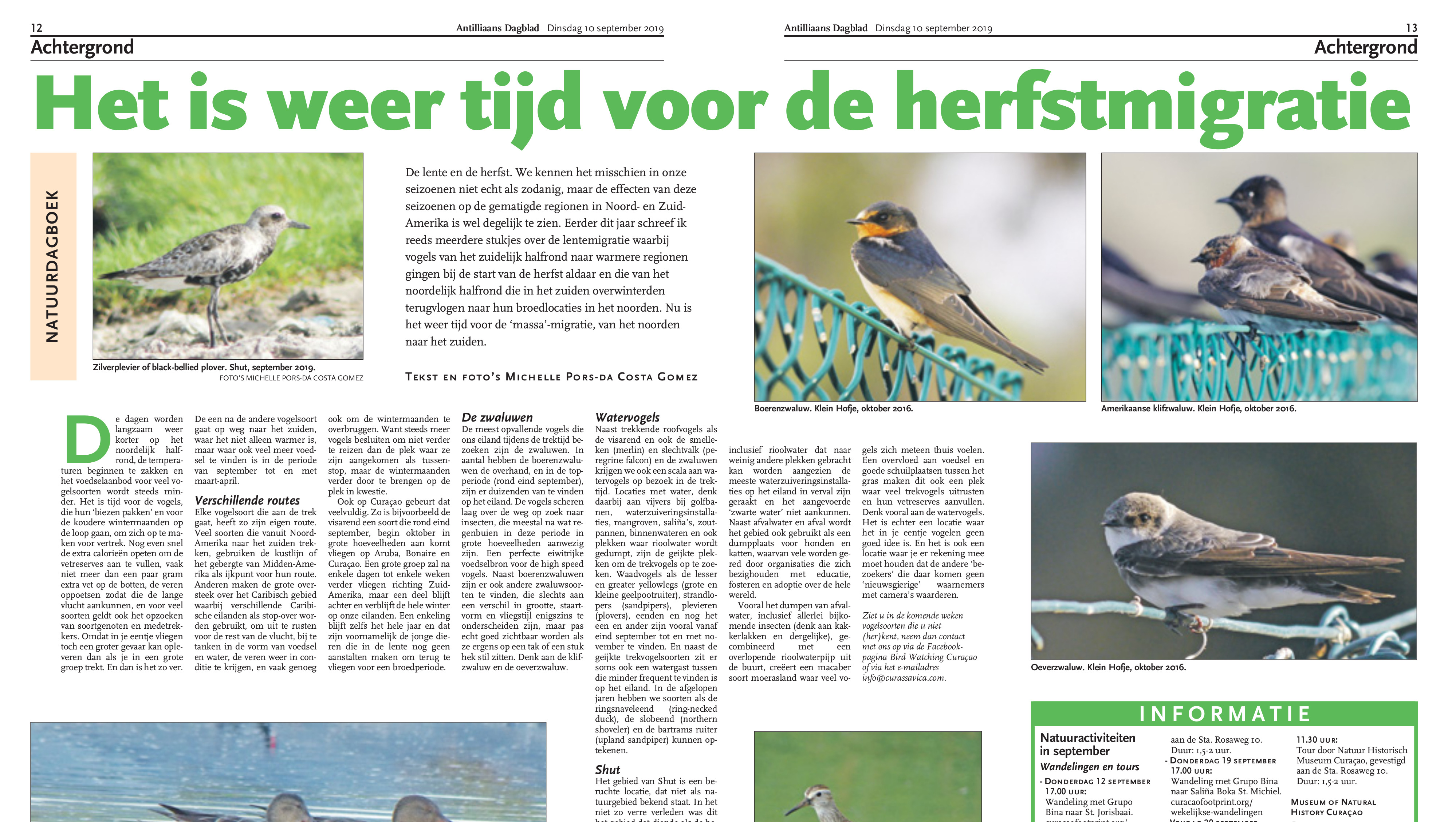 Een selectie van deze natuurverhalen, in woord en beeld, worden nu samen gebundeld in de eerste van een nieuwe serie natuurboeken over de natuur van het eiland. ‘De Vogels van Curaçao’, geeft een blik in de wereld van de op het eiland levende en het eiland bezoekende vogels met foto’s van de hand van Michelle Pors-da Costa Gomez en Leon Pors en bijdragen van Anita di Moulin, Rob Wellens, Carel de Haseth, Job Stumpel, Henny Klein Klouwenberg en Hubert de Palm.