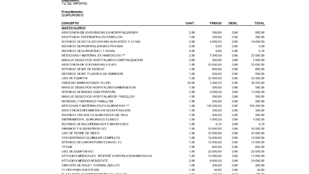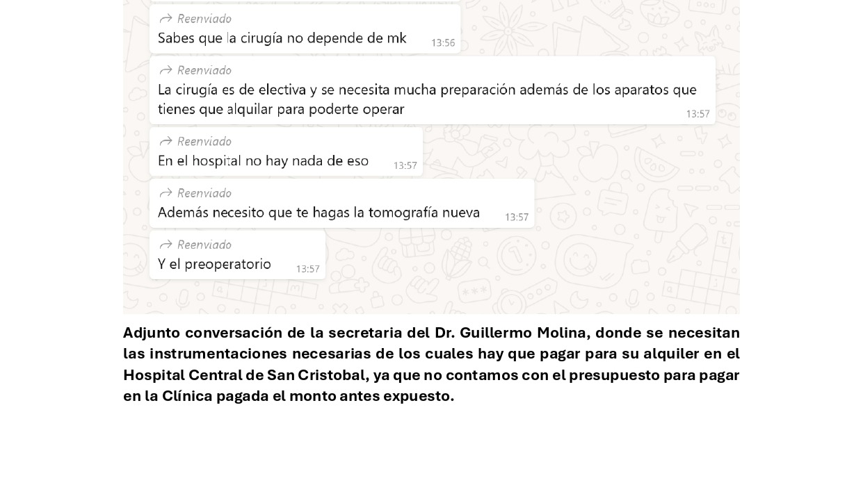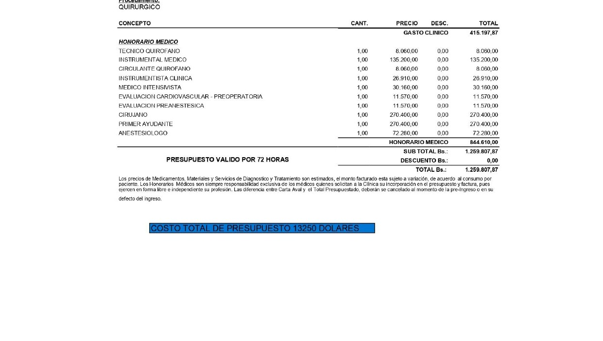 El medico Luis Guillermo Molina Ortiz me hablo de dos presupuestos: uno por privado y el otro por el público y ninguno me favorece, realizar la cirugía por la clínica tiene un costo de trece mil doscientos cincuenta dólares 13250$ presupuesto valido por 72hrs, una suma insostenible para mí, no hay forma de que pueda reunir esa cantidad de dinero y por el hospital público del Táchira necesitaría asumir los gastos del alquiler de los equipos antes mencionados.