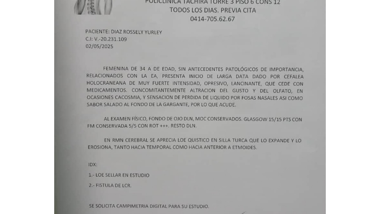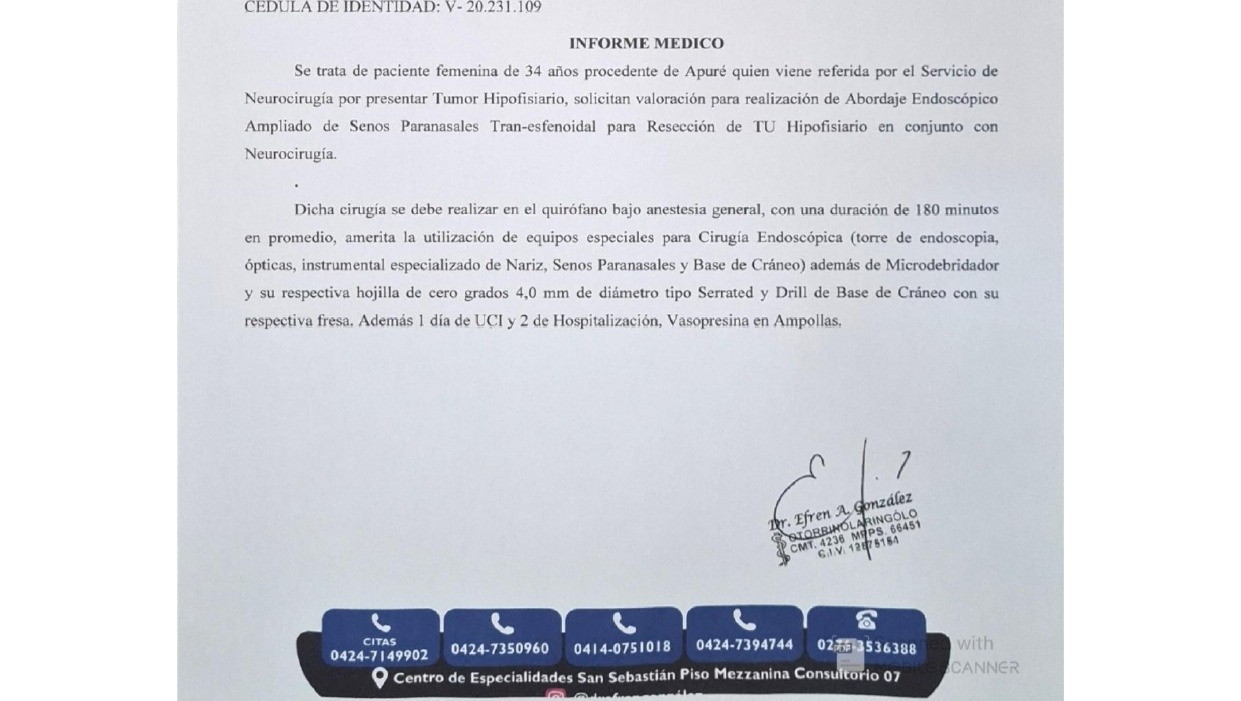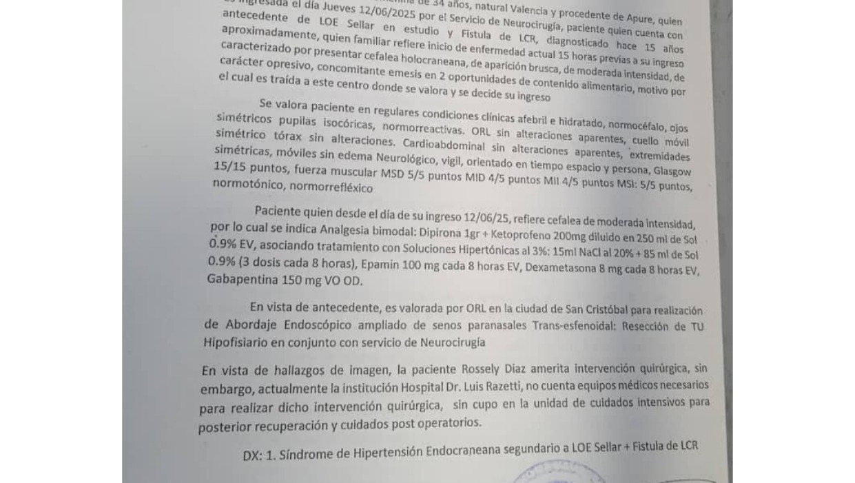 soy Rossely Diaz de 34 años, el día 12/06/2025 fui ingresada de urgencia en el Hospital Universitario Dr. Luis Razetti en el Edo Barinas, preciso con urgencia de una Cirugía transesfenoidal trasnasal endoscópica o también llamada Adenomectomía a causa de un tumor Adenoma Hipofisiario en la silla turca, sin embargo actualmente dicha institución hospitalaria no cuenta con los equipos médicos necesarios para realizar la intervención por lo que he sido trasladada de emergencia el día 13/06/2025 al Hospital Central de San Cristóbal (donde el director de dicho hospital es Dr. Alexander Krinitzky) donde se encuentran los especialistas, pero en esta institución tampoco cuenta con los equipos antes mencionados y necesarios para llevar a cabo la cirugía que necesito de modo que hay que alquilarlos, pero carecemos de recursos y medios económicos, por otro lado tenemos un presupuesto por clínica privada el cual tampoco podemos asumir, por lo que mi vida depende primeramente Dios y de quien pueda prestarme su apoyo, en las páginas finales adjunto todos los estudios más reciente que me he realizado y el presupuesto proporcionado.