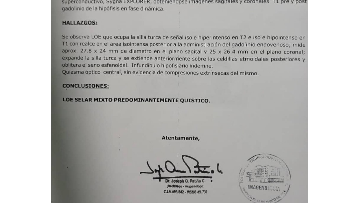 En la última resonancia y demás estudios realizados entre los meses de Abril-Junio arrojaron hallazgos poco favorables, como era de esperarse después de tantos años sin hacerle seguimiento, dichos resultados indican que el tumor como antes mencione ha crecido provocando una lesión ocupante de espacio quístico con deformidad en silla turca, el tumor se encuentra en un punto donde no se aconseja realizar una operación transcraneal, a Dios gracias por la oportunidad de que exista esta Cirugía transesfenoidal trasnasal endoscópica o también llamada adenomectomía, una cirugía igualmente compleja pero menos invasiva que la transcraneal. El médico neurocirujano que ahora mismo lleva mi caso con consulta privada en la ciudad de San Cristobal estado Táchira- Venezuela, es el Dr Luis Guillermo Molina Ortiz, especializado en oncología y cirugía endoscópica que en conjunto con el Dr. Efren Gonzáles Otorrinolaringólogo y su equipo médico realizan dicha Cirugía. Cabe destacar que hasta ahora de un modo u otro y con muchas carencias hemos podido sobrellevar los gastos que en su gran mayoría son costosos para mi situación económica, tanto las consultas como los exámenes, los estudios avanzados cuestan mucho dinero, yo considero que como personal especializados tienen conocimiento de lo costoso que es, pero para mí infortunio nos quedamos sin recurso alguno y ya no aguanto más vivir con tanto dolor, hoy me encuentro luchando por mi vida pero estoy sufriendo debido a que hasta ahora ningún calmante suministrado es de ayuda para descansar de tal sufrimiento, he perdido calidad de vida, descanso, de apetito, mi estado anímico también se ve afectado, solo quiero vivir con dignidad, me gustaría descansar, me gustaría vivir sin dolor, por esta razón acudo a ustedes en clamor de auxilio con la esperanza que atiendan mi caso, cualquier aporte seria de gran ayuda.