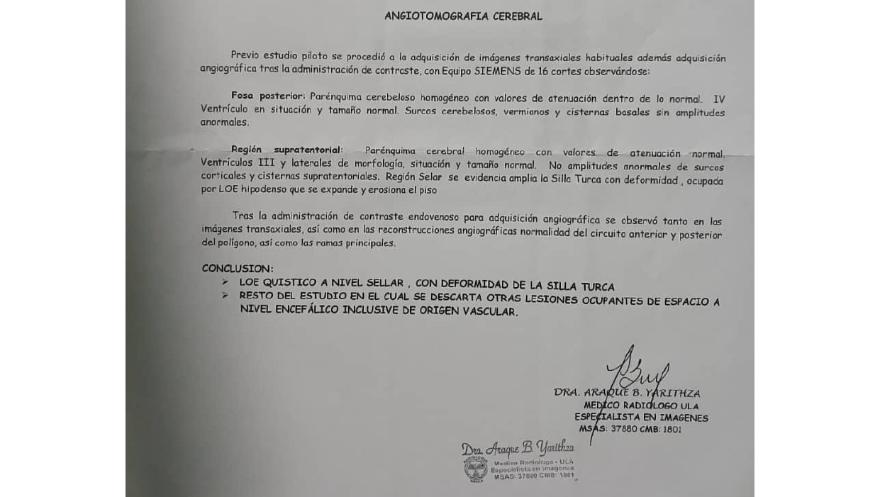 El estado crítico actual de mi salud nos ha superado a mis padres, a mí y demás familiares, el tumor que una vez tuvo el tamaño de un guisante actualmente tiene unas dimensiones mayores a tal punto que ha producido una fisura en el cráneo, ocasionando la perdida de líquido cefalorraquídeo esto hace más complejo mi situación por lo que necesito intervención urgente. Hace más de diez años fui diagnosticada con un Adenoma Hipofisiario en la silla turca, para entonces se intentó gestionar la intervención quirúrgica transcraneal que en su momento era la única opción, pero cabe destacar basado en la opinión médica una cirugía muy riesgosa ya que existía una alta probabilidad de daños a estructuras nerviosas, problemas con el habla, la memoria, derrames, debilidad muscular, la visión, la coordinación y otras funciones que podían ser temporales o permanentes, por lo que un médico en San Fernando de Apure Neurólogo me aconsejo vivir con el tumor y no tocarlo, así que prescribiendo medicamentos para controlar el crecimiento de dicho tumor me mando a casa y animo a llevar una vida normal, pero la realidad es que desde entonces no he logrado tener una vida normal, nada más lejos de la realidad, mi vida ha sido dolor tras dolor. Vengo de una familia de escasos recursos, en definitiva, nada ha sido fácil por lo que al principio mis padres y yo nos esforzamos en que la medicina no faltara, Dostinex (usada para reducir la cantidad de prolactina que produce un adenoma, entre otras medicinas más) pero en adelante no pudimos sostener los costos mensuales del tratamiento ni de la dieta alimentaria que debía mantener, por lo que hubo un momento que se volvió inviable continuar con el tratamiento para nuestro pesar.