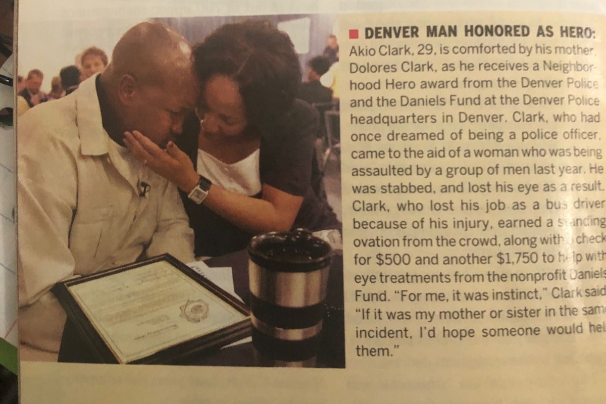Hello Everyone! My name is Dolores Clark. In August of 2004, my son Akio Clark was severely injured in efforts to rescue a young woman who was being attacked by several male parties. His quick and unselfish actions stopped the attack however, resulted in the loss of his left eye. Later on in 2005 Akio was honored as "Hero" recognized by the Denver Police Department and awarded with funding from the nonprofit "Daniels Fund" to help assist with eye treatments.