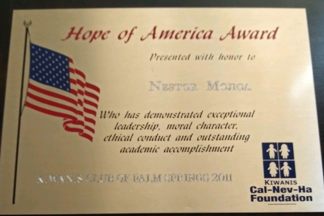 Nestor's Hope of America Award, showing the kind of person he was - "Who has demonstrated exceptional leadership, moral character, ethical conduct, and outstanding academic accomplishment"
