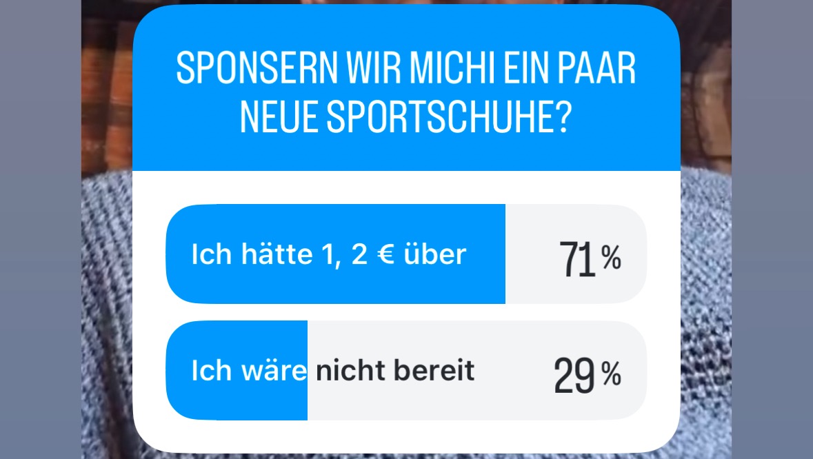 Ich bin der Admin der Instagram-Page gruppe.unbekannt und habe ein Video von Michael Schloter gesehen, in welchem er sagt, dass er aktuell mit kaputten Sportschuhen trainiert, weil ihm die finanziellen Mittel für Neue fehlen.