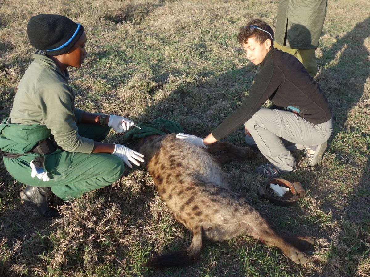 Main photo: Drs. Mukami Ruoro and Christine Wilkinson observe a sleeping spotted hyena. All operations conducted with proper permits and ethical approvals. Photo by Christine Chepkisich.