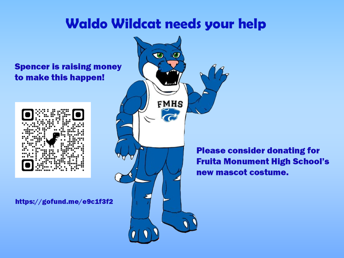 Meet "Waldo Wildcat! We finally have approved artwork to show! I'm Spencer Robbiano, a junior at Fruita Monument High School. I am raising money to purchase a brand new mascot costume. Please help me make our Wildcat Mascot have a prominent place at school functions and to take our school spirit to a new level! It is my thought that having a friendly and recognizable character and relationship with our Wildcat Character will make a positive impact and help folks feel more included in our school community.
