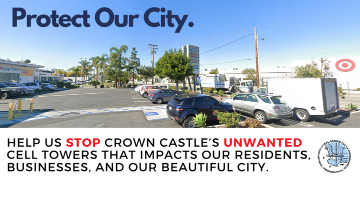 As a unified coalition of concerned Northeast Torrance residents, homeowners and business owners, we’ve been steadfastly organizing for over a year and successfully kept Crown Castle from installing a 70 to 90 ft fake tree cell tower at 2124 Redondo Beach Blvd. Torrance CA 90504. We strongly OPPOSE the installation of any wireless telecommunications facility in our beloved community where there is established sufficient wireless coverage from at least two identifiable wireless facilities that are less than half a mile away.