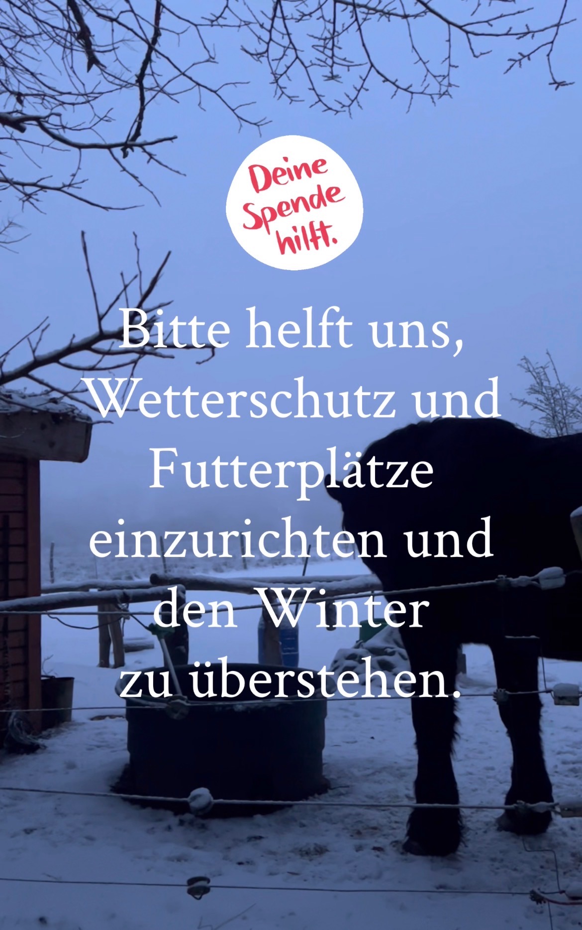 Sollten mehr Spenden eingehen als für die Anschaffung der Weidezelte und Heuboxen benötigt werden, verwenden wir diese ausschließlich für den zusätzlichen Futterbedarf (Heu und notwendiges Zusatzfutter), der durch die aktuelle Wetterlage entstanden ist. Durch den dauerhaften Frost benötigen unsere Tiere (Pferde, Wasserbüffel, Schafe, Ziegen, Hühner) aktuell deutlich mehr Energie, und unser Heuverbrauch liegt derzeit nahezu doppelt so hoch wie in früheren Wintern.