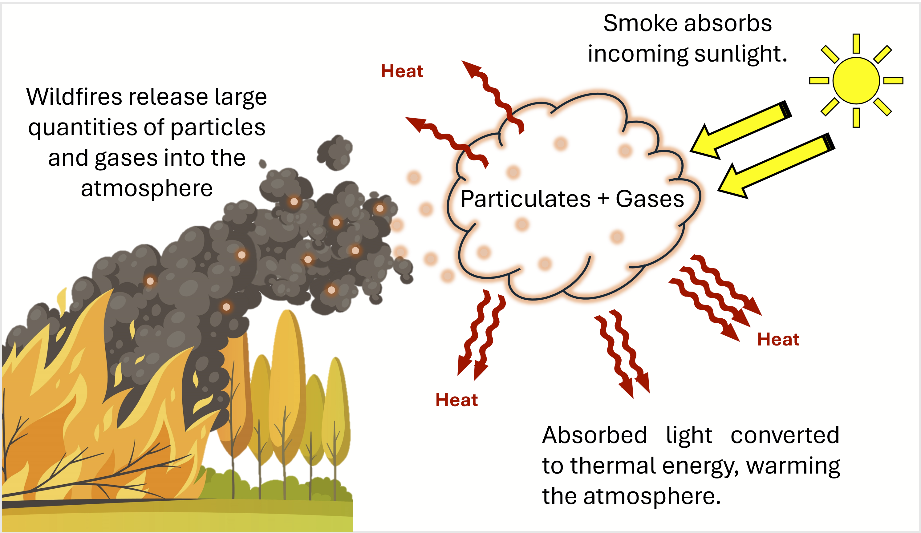 Brown carbon consists of a complex mixture of aerosol (a-BrC) and gaseous (g-BrC) organic molecules that are characterized by their capacity to absorb light. Owing to these properties, BrC captures solar radiation as it passes through the Earth’s atmosphere - this light energy is converted into heat, which subsequently warms the surrounding atmosphere. Recent studies have established that BrC is a key factor contributing to global climate change because of this warming potential; as such, there is growing concern that BrC will escalate atmospheric warming as global wildfires continue to intensify.