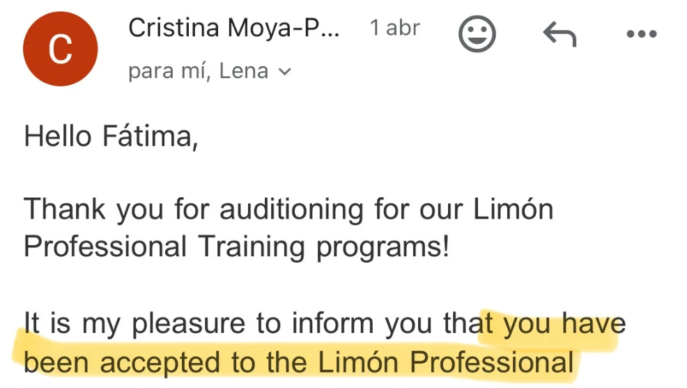Hola :) mucho gusto, soy Fátima Muñiz. Bailarina originaria de Monterrey, Nuevo León. En marzo asistí a una audición en CDMX para formar parte del Programa Profesional de Limón Dance Company de Nueva York y hace días recibí la noticia: ¡me aceptaron!