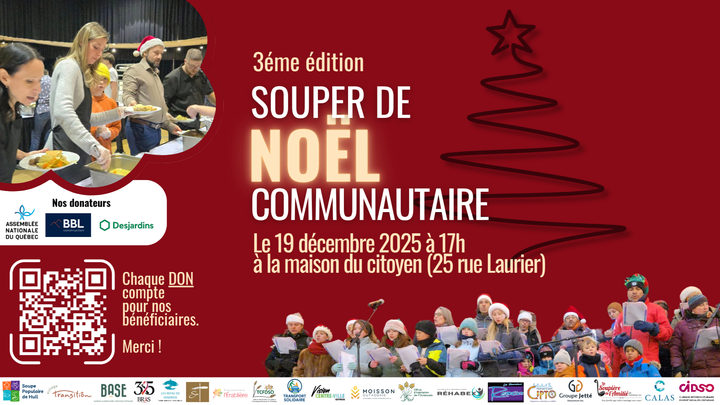 Cette année, Transition Québec s’associe à plusieurs partenaires de cœur pour organiser un souper de Noël communautaire destiné aux personnes les plus vulnérables de notre région. L'an dernier, 350 personnes ont été accueillies.