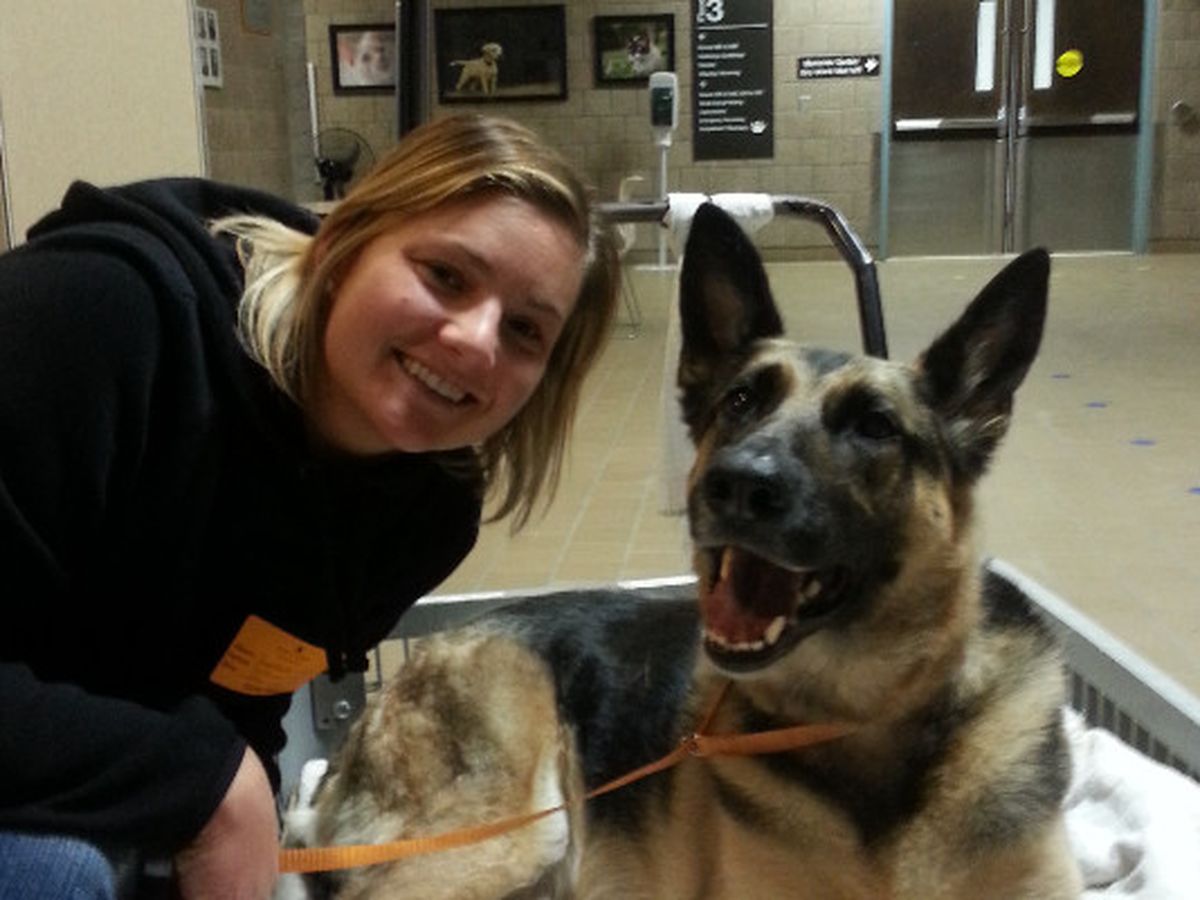 Kilo is our beautiful, 5 1/2 year old German Shepherd who we rescued from a grain elevator nearly 5 years ago. Filthy with fly bites on her ears, parasites and a wild spirit, she quickly took hold of our hearts. She recently suffered a disc rupture between her L2/L3 vertebrae resulting in loss of sensation and paralysis of her back legs. This all started Friday, 3/06/2015 when we were playing fetch in the yard. I heard her yelp slightly as she caught the ball and then she immediately stopped playing. Everything appeared that she had just perhaps strained a muscle since she was still walking and eating normally up until bedtime that night.