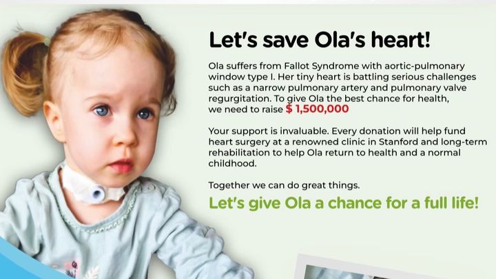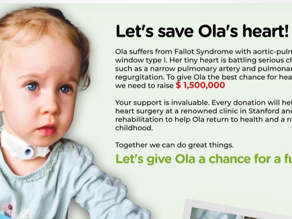 Ola suffers from fallot syndrome with aortic - pulmonary window type i .her tiny heart is battling serious challenges such as a narrow pulmonary artery and pulmonary valve regurgitation.to give ola the best chance for health,we need to raise 1,500,000$