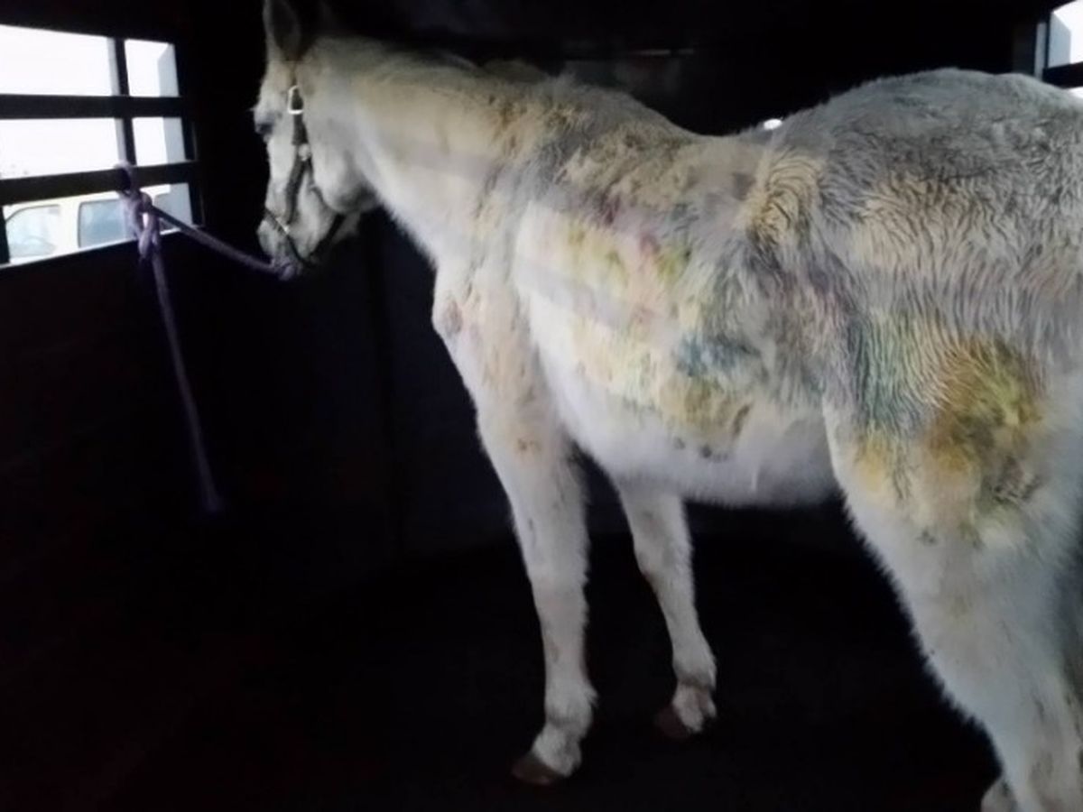 The horse is an approximately 20-year-old Arabian/app pony cross. The pony scored a low body condition and is blind in the right eye. In addition to having a slight temperature, it was apparent the pony had been shot with a paint gun nearly 130 times. The pony was sore to the touch. The sales stable veterinarian evaluated the horse and provided treatment and pain medication in order for her to be transported to New Bolton Center by Omega Horse Rescue.