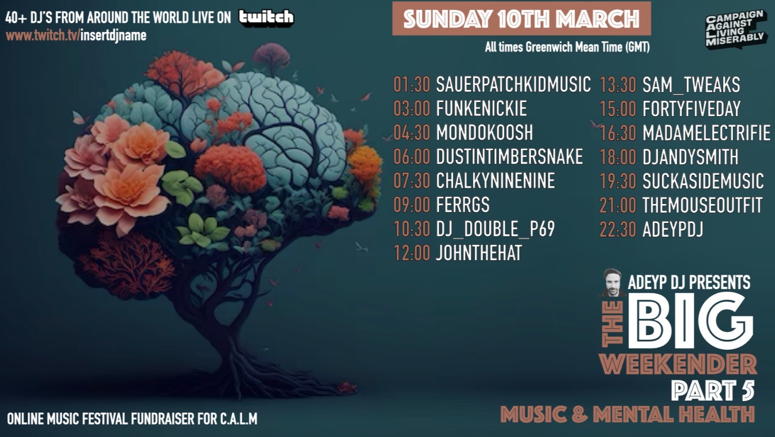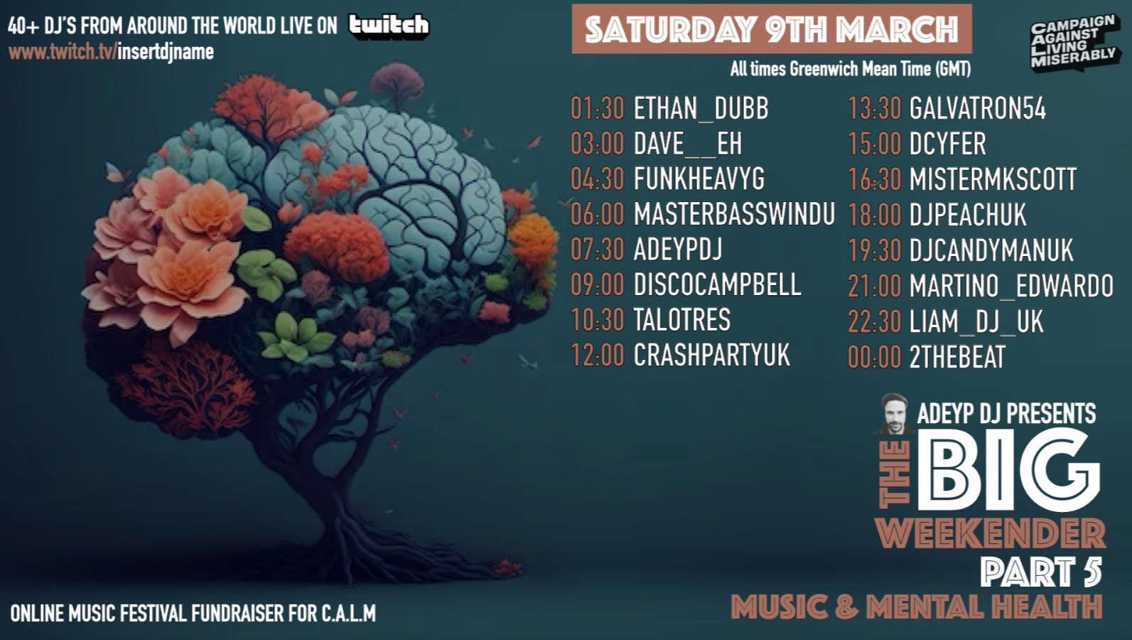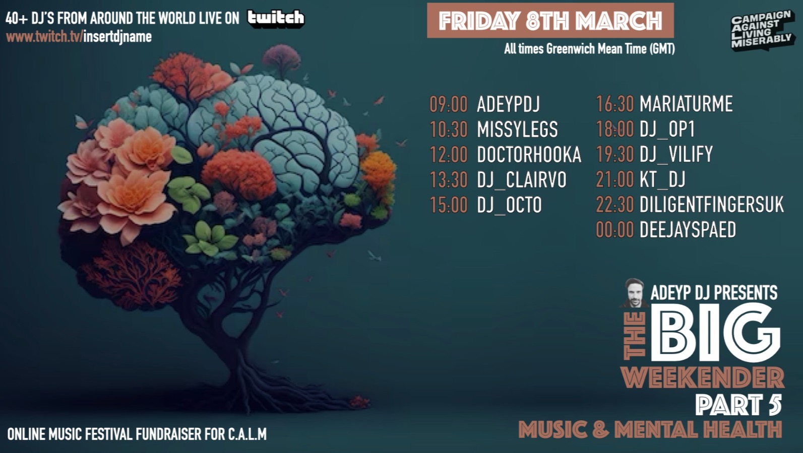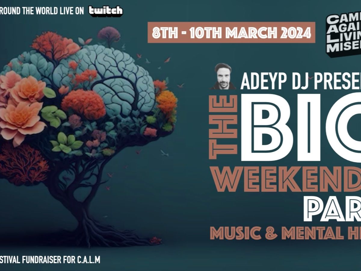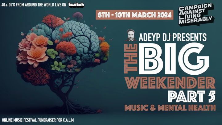 38 DJ's from around the world back-to-back sets. Starts at 9am on Friday 8th and finishes Sunday 10th of March at 10:30pm, with some of the biggest names on twitch giving up their time to create an unforgettable experience, with the hope of raising as much cash for CALM and promoting positive mental health awareness.