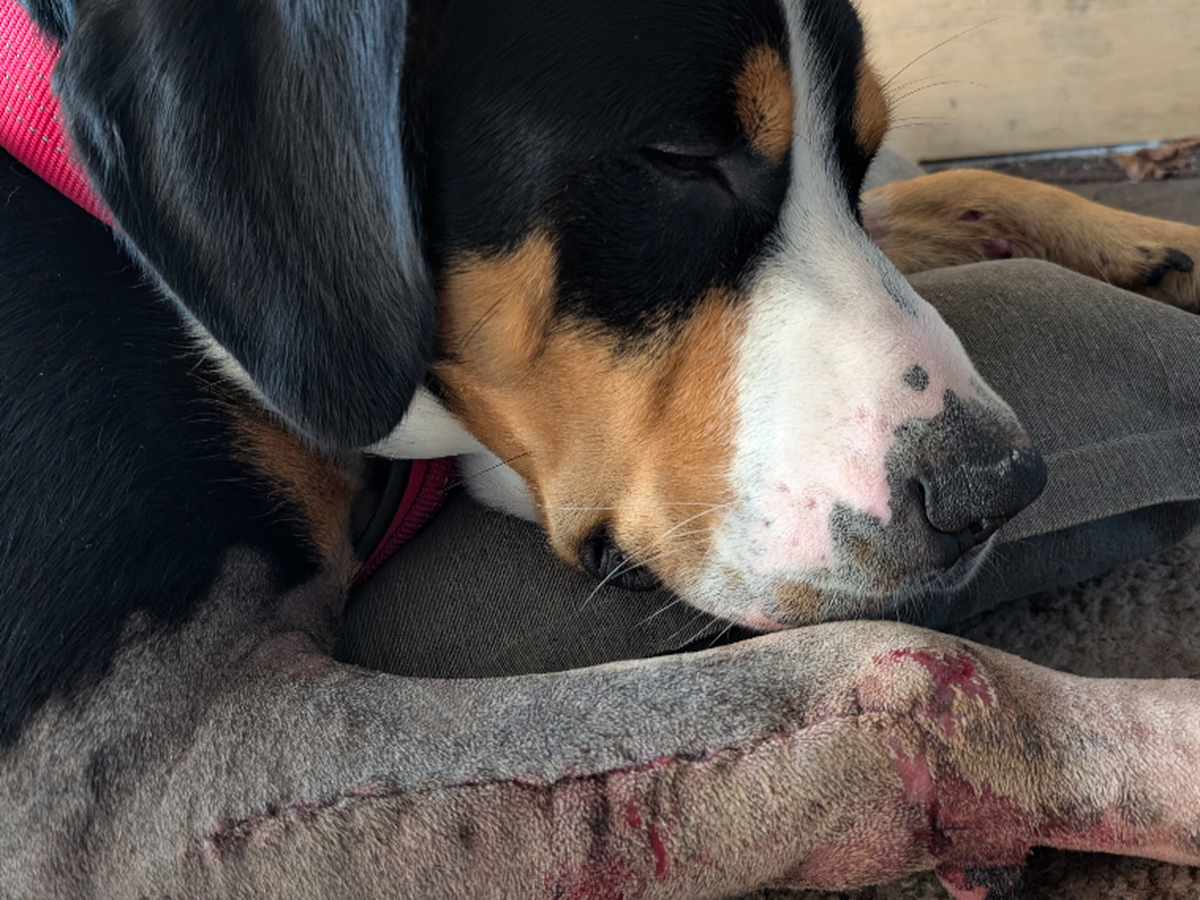 Pula, onze Grote Zwitserse Sennenhond van 1 jaar en 4 maanden, is op 4 augustus 2024 aangereden door een auto. Daarbij is zijn voorpoot verbrijzeld doordat de autoband over zijn poot is gereden. Een dag later is hij geopereerd, direct was niet mogelijk ivm de flinke zwelling. Het was een zeer complexe breuk, waarbij 2 platen zijn geplaatst en we moesten hopen dat het goed zou komen. Elke 2 weken een röntgenfoto, zware pijnstillers en dubbele antibioticakuur. Het leek heel langzaam vooruit te gaan, totdat hij een botinfectie kreeg die het botweefsel begon weg te vreten.