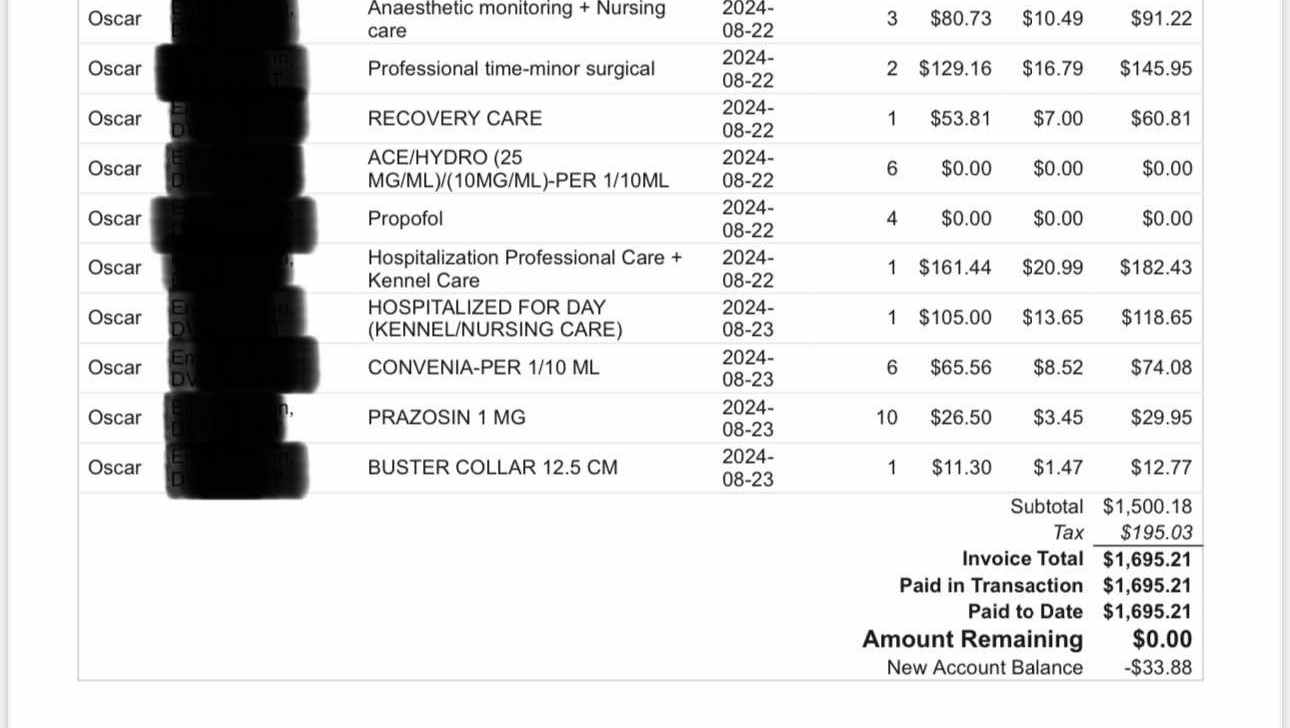 This all happened on Thursday. He stayed at his regular vet Thursday night and Friday during the day and then I had to transfer him to another vet clinic because our vet clinic closed for the weekend.