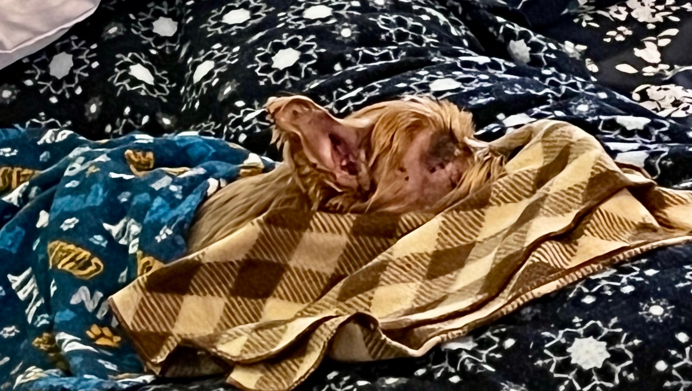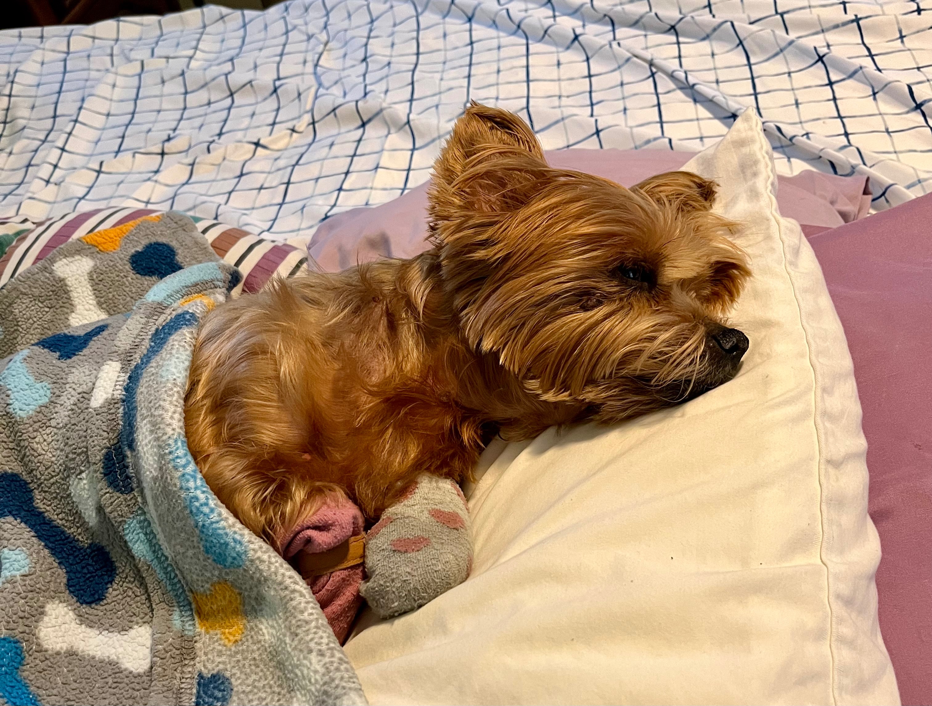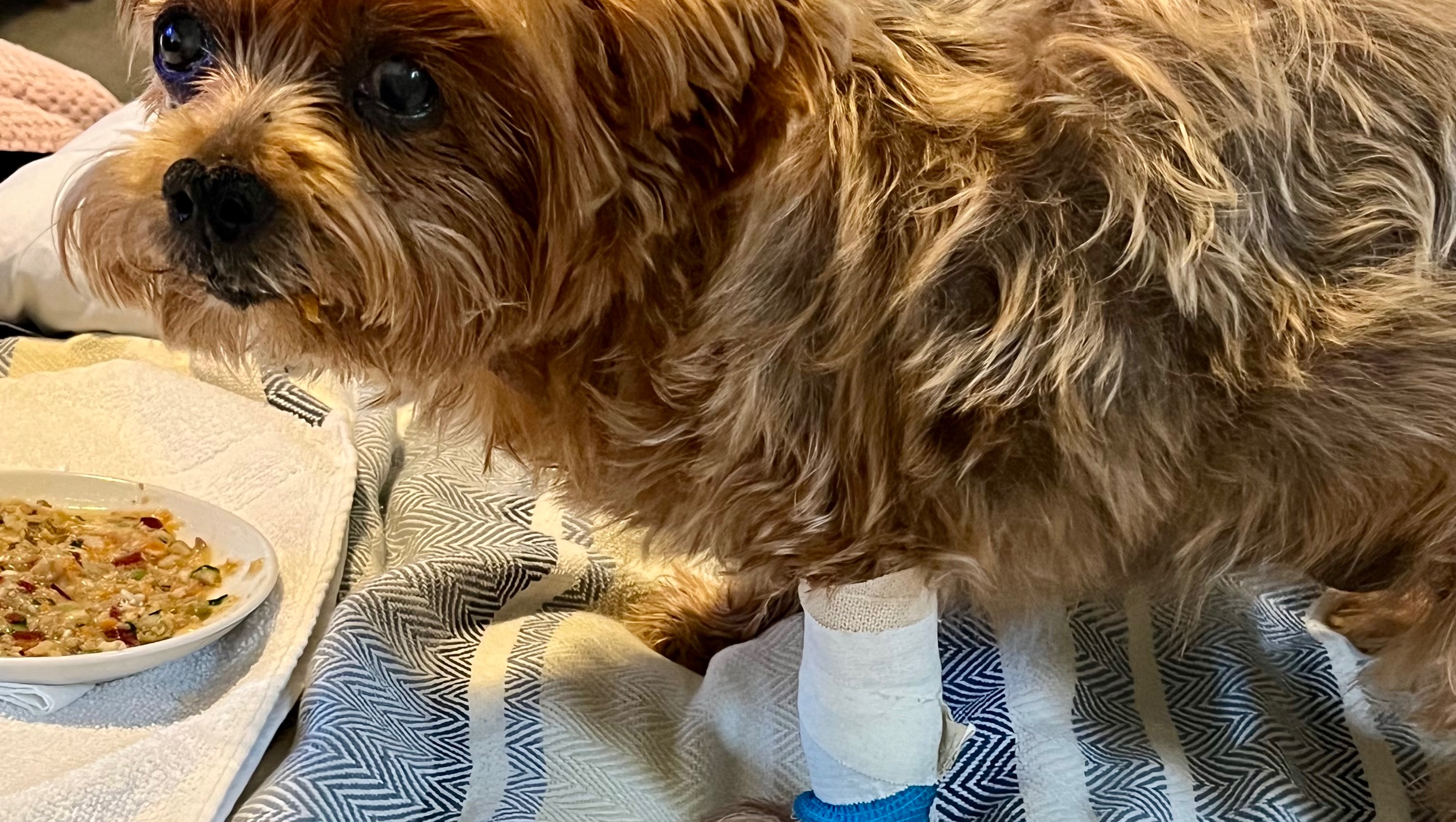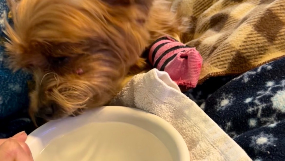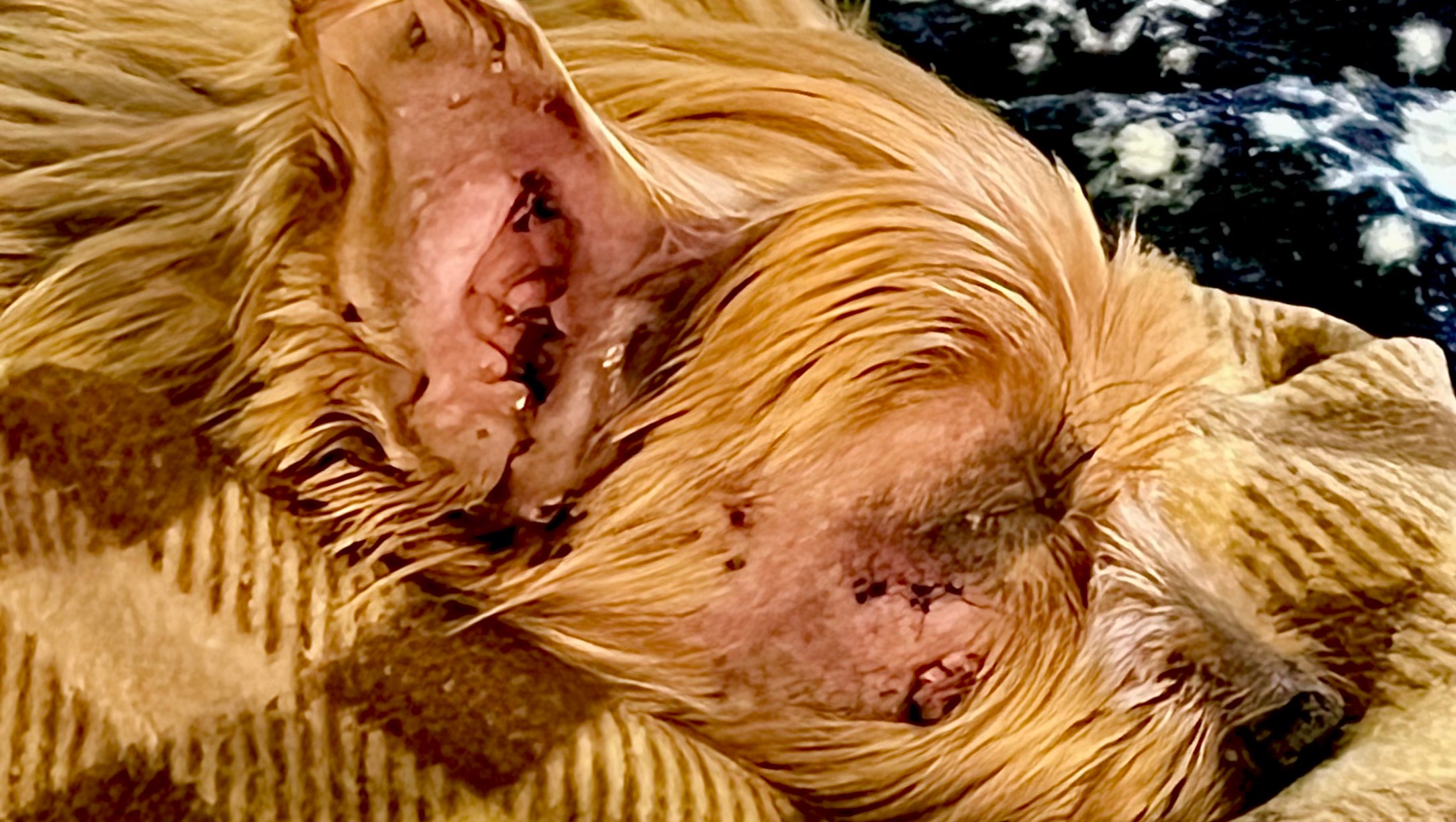 Zuki’s home now, recuperating post surgery, she has tolerated the procedure well, still a little bit drowsy from the anesthesia, she’s able to sip some fluids and ate some soft liquify ( protein and fiber rich ) food now, still very fragile, she just sleeps and in her bed most of the time, able to walk with supervision(gait unsteady at times), kept hydrated and comfortable, puppy steps for now but has good demeanor of full and anticipated recovery. She will have a follow-up appointment in a few days(bandage change, etc.), we’re still waiting for her biopsy results, lab results panel looks good despite her old age and being just a little chunky. She’s on ATB for the wounds and UTI.