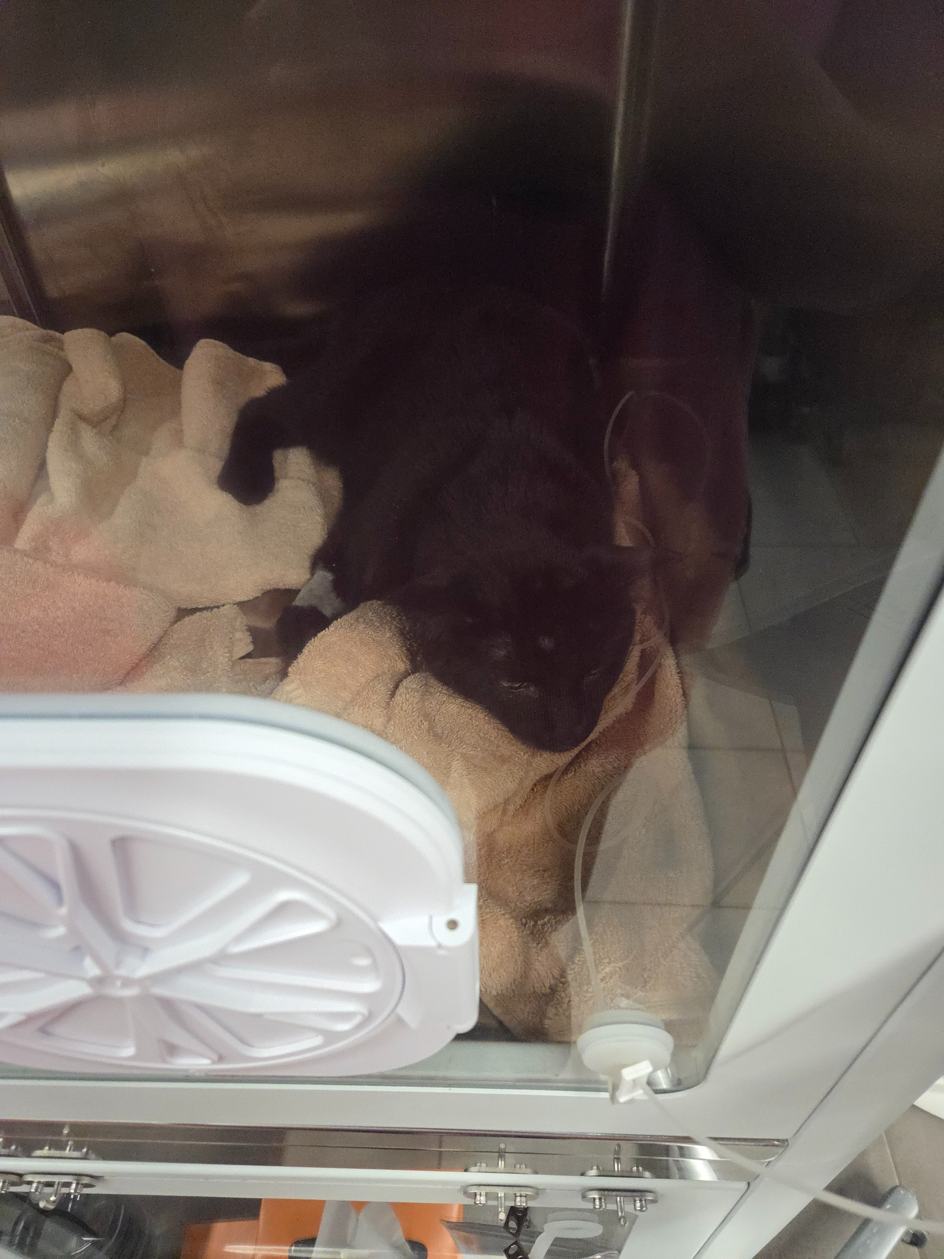 It was such a scary, horrific thing for us to witness and overhear the doctors shouting, “HE’S TURNING PURPLE! ALL HANDS!” After they managed to stabilize him and run ultrasounds and x‑rays, the doctor came over to us with a box of tissues. She explained that Stevie was in congestive heart failure and had pulmonary edema (fluid in his lungs), and that if he were to have any chance, he would need to receive diuretics and be kept in an oxygen tank for 24–48 hours. She also explained that Stevie was limping on his paw because he “threw a clot in it,” which led to the saddle thrombus (sudden limb paralysis).