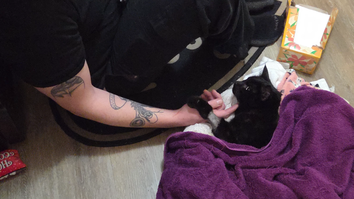 On Saturday night into early Sunday morning, just before the big blizzard, we noticed that he was making a lot of noise in his playpen. When I took him out, George saw that Stevie wasn't moving his back legs at all. We knew then that he had thrown another clot and had back limb paralysis. We were absolutely devastated and heartbroken. Stevie had been doing well and improving, and the turn was sudden and shocking. We could tell Stevie was now in noticeable pain and he could not walk or use the box anymore, despite trying to reach it. I called some vets to try and make arrangements for at‑home euthanasia so that he could be in a safe, comfortable place surrounded by his family.