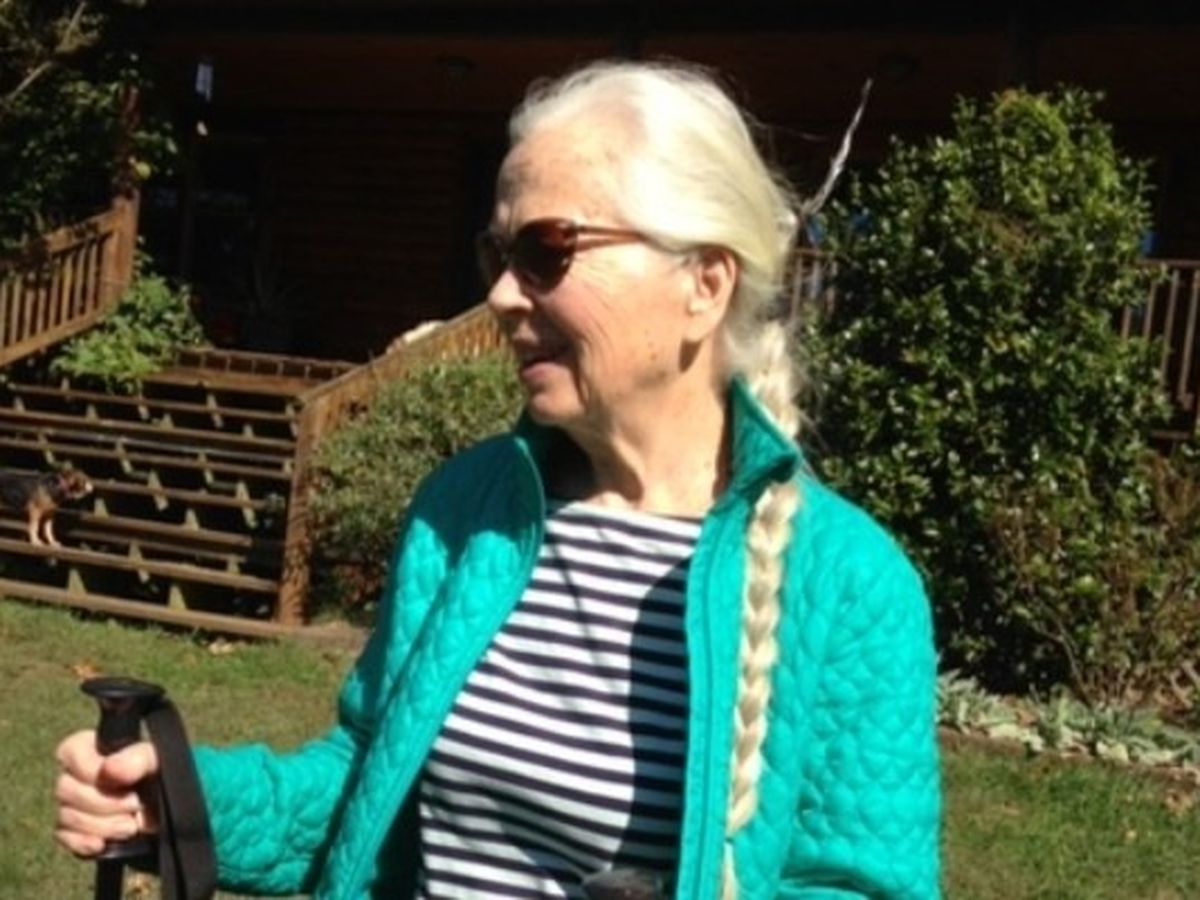 She is standing in front of the home her late husband built in the foothills of the Virginia Blue Ridge Mountains, setting out on a morning hike with her dogs.