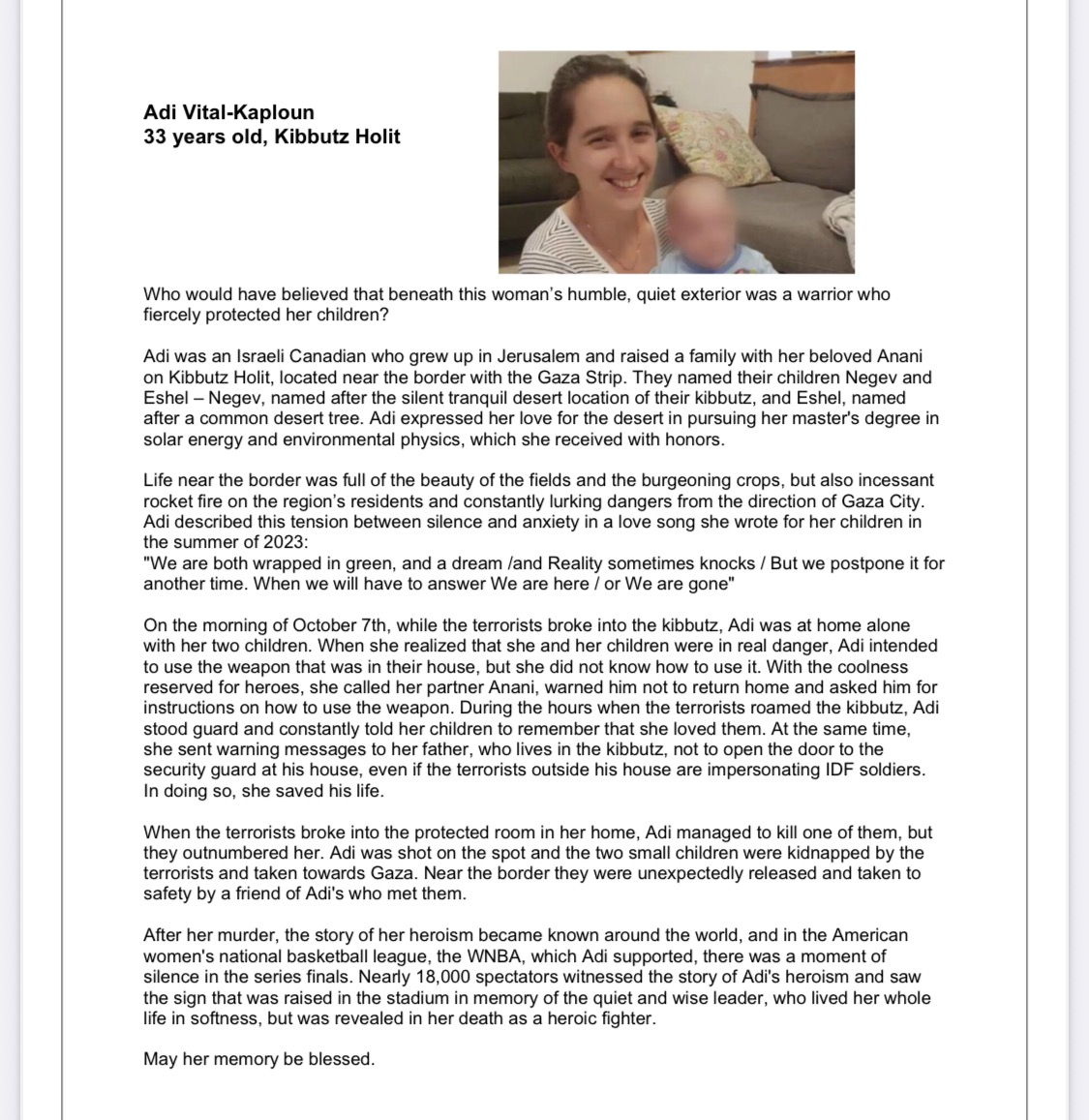 This fundraiser is in honor of Adi Vital Kaploun (ז״ל) - a woman who was murdered Oct 7 while protecting her young children. She was 33.