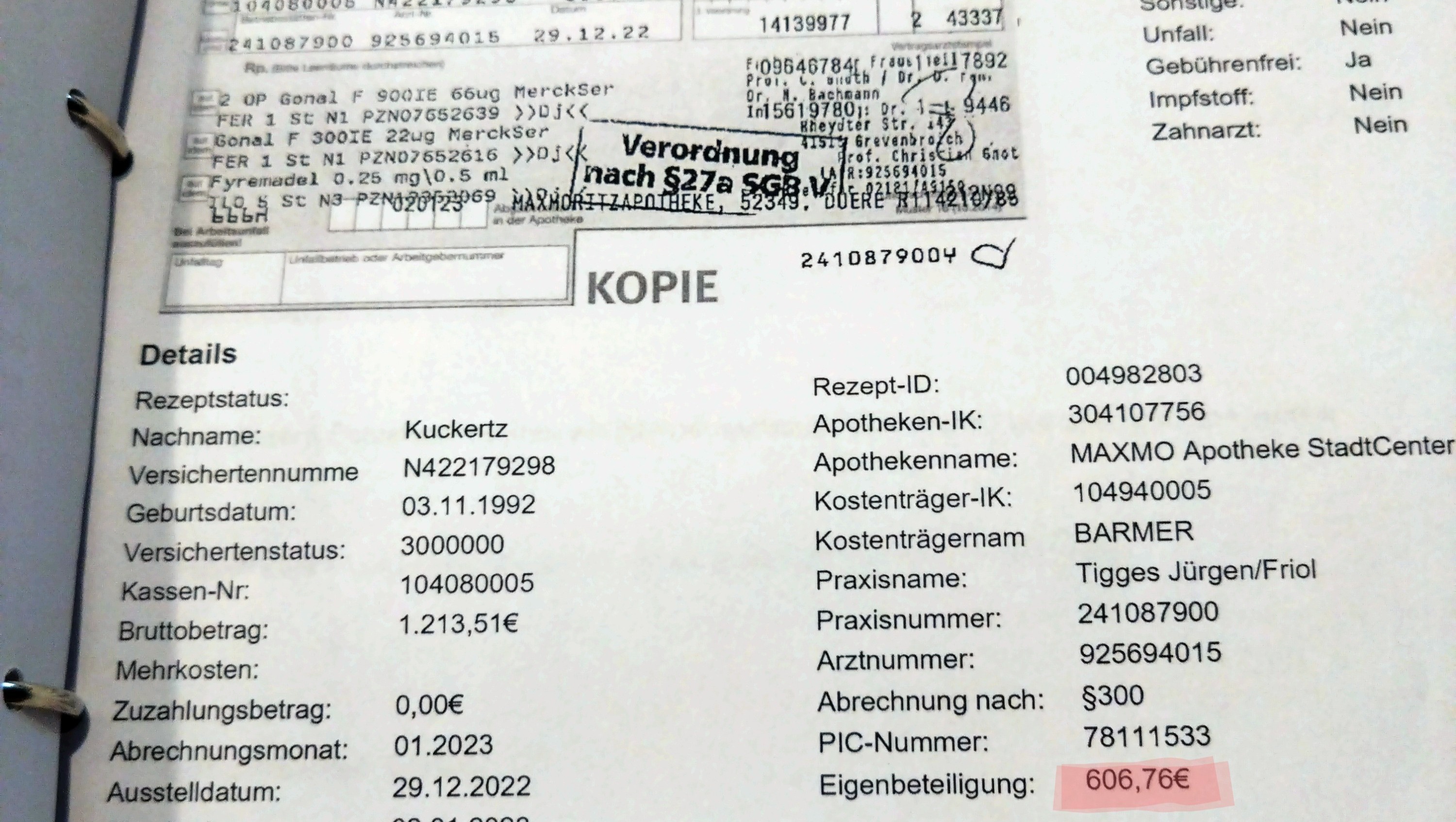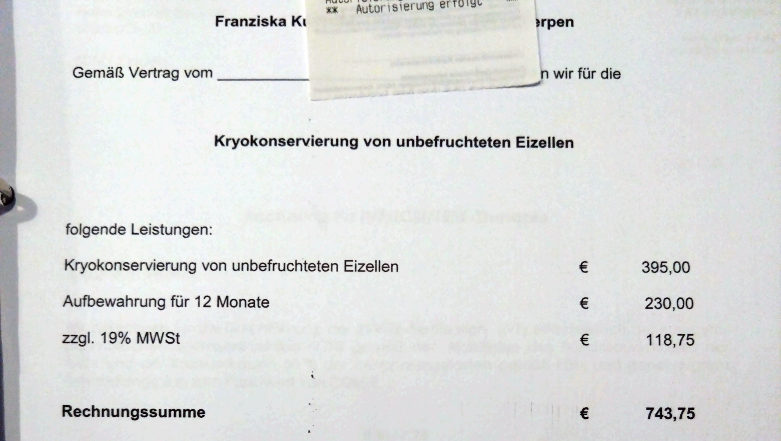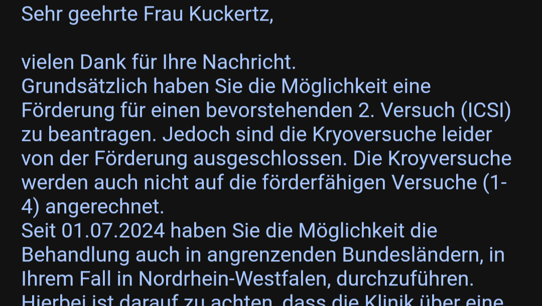 Uns steht keine Unterstützung der Krankenkasse oder vom Bundesland zu, weil dies ein Kryoversuch ist. Dies ist eine E-mail vom Bundesland.