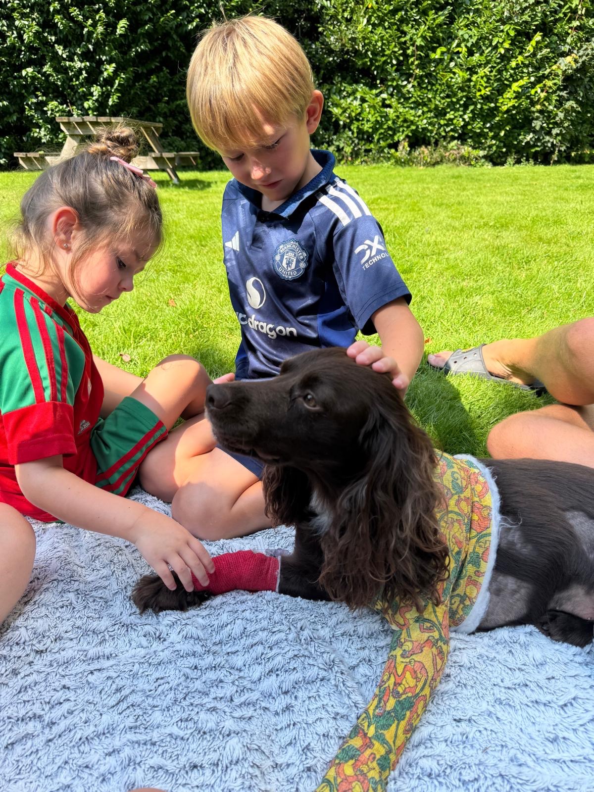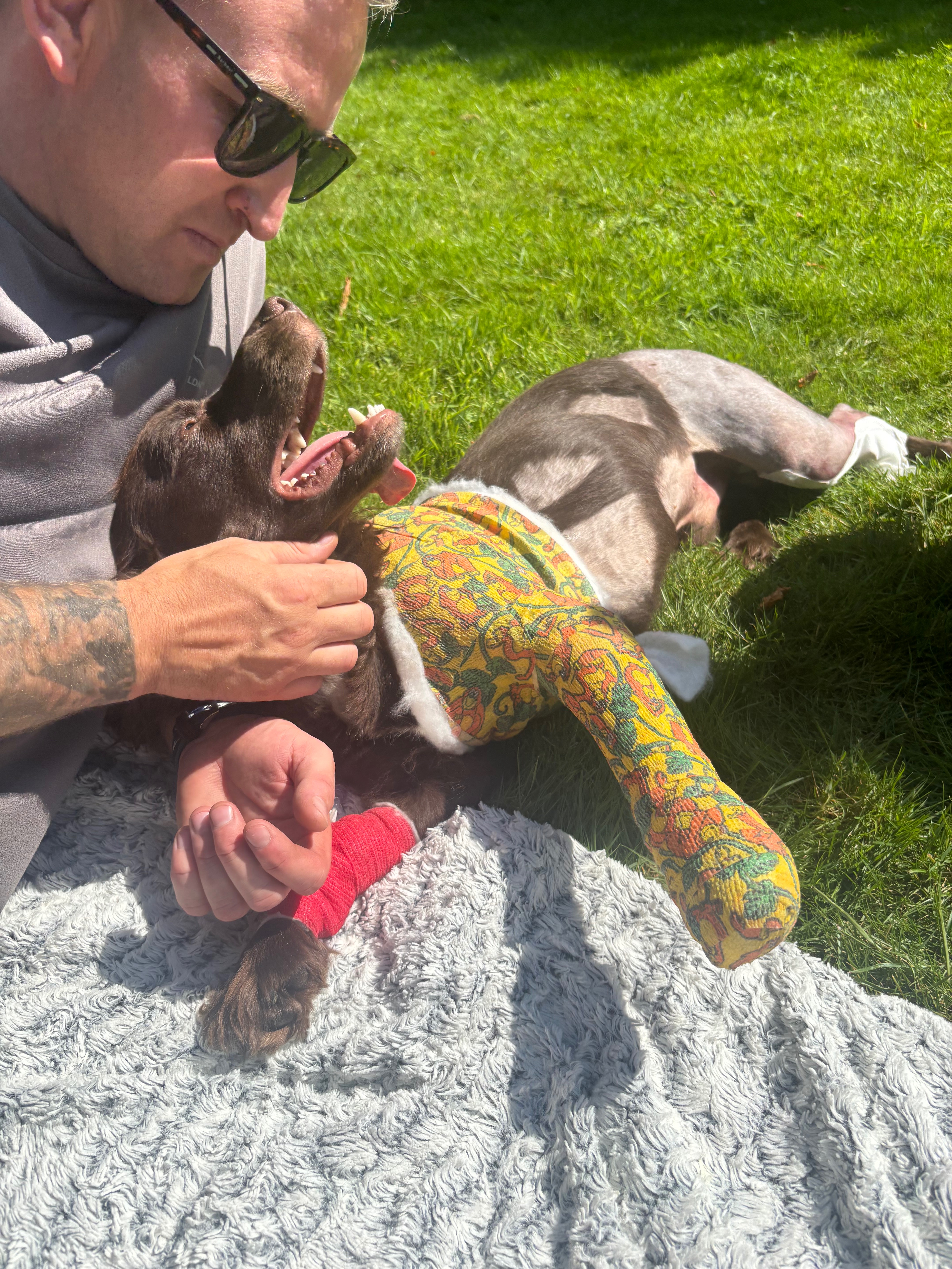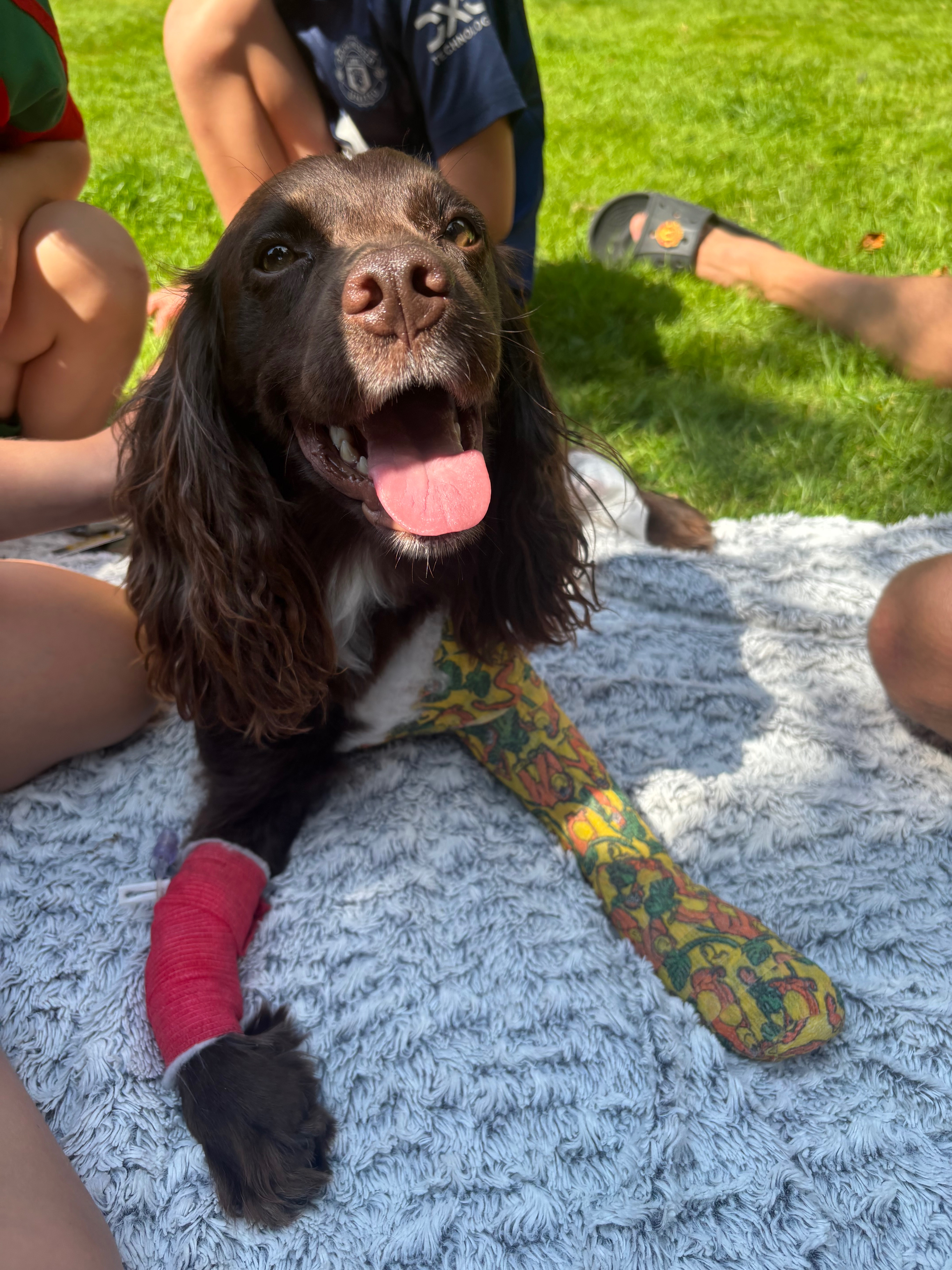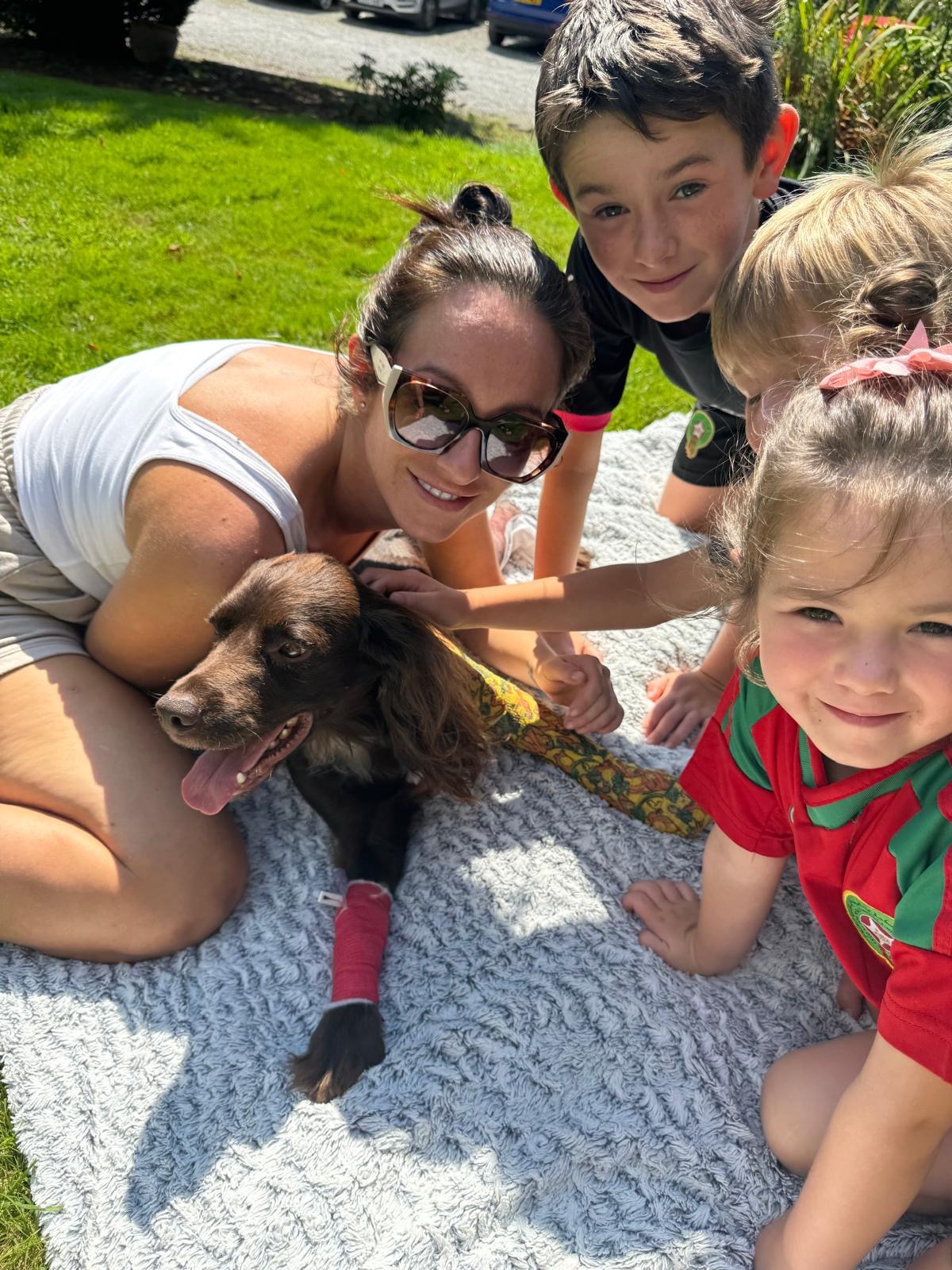 On Thursday the 14th of August around 8pm Hugo was out for an evening walk on Westgate with his dad Alan and 2 of Alan's 3 young children. Hugo was on the grass playing with kids but got spooked by something over the road and ran out into the road Alan shouted him and ran to him but as hugo ran back towards Alan a van came over the hill at around 60 mph Alan shouted in the road for the van to stop but it carried on swerved around Alan and straight over Hugo. After knowingly hitting Hugo the van didn’t stop leaving Alan to pick him up out the road and carry him home, with the 2 children very distressed witnessing it all. Bay vets have done an amazing job looking after Hugo. He suffered a broken tibia and fibula in one leg and a dislocated elbow in another he has had to undergo 6 hours of surgery and now has a metal plate and pins in his back leg and a splint and bandage on his front leg luckily he survived but the family now have a big vet bill to pay of £3500 and Hugo’s recovery is going to be a long road and they will need to make adaptations to his life to help him recover as well as possible.