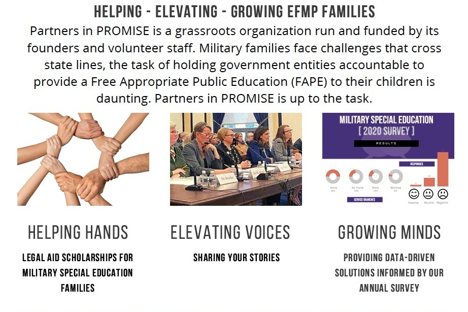 Partners in PROMISE exists to Protect the Rights Of Military children In Special Education (PROMISE) through educating and advising the legislative agendas of military service organizations, Department of Defense and public officials. We have seen tremendous success in our efforts, with proposed legislative change included in this year's 2021 National Defense Authorization Act (NDAA) and live programming updates released by the Navy and Air Force this year.