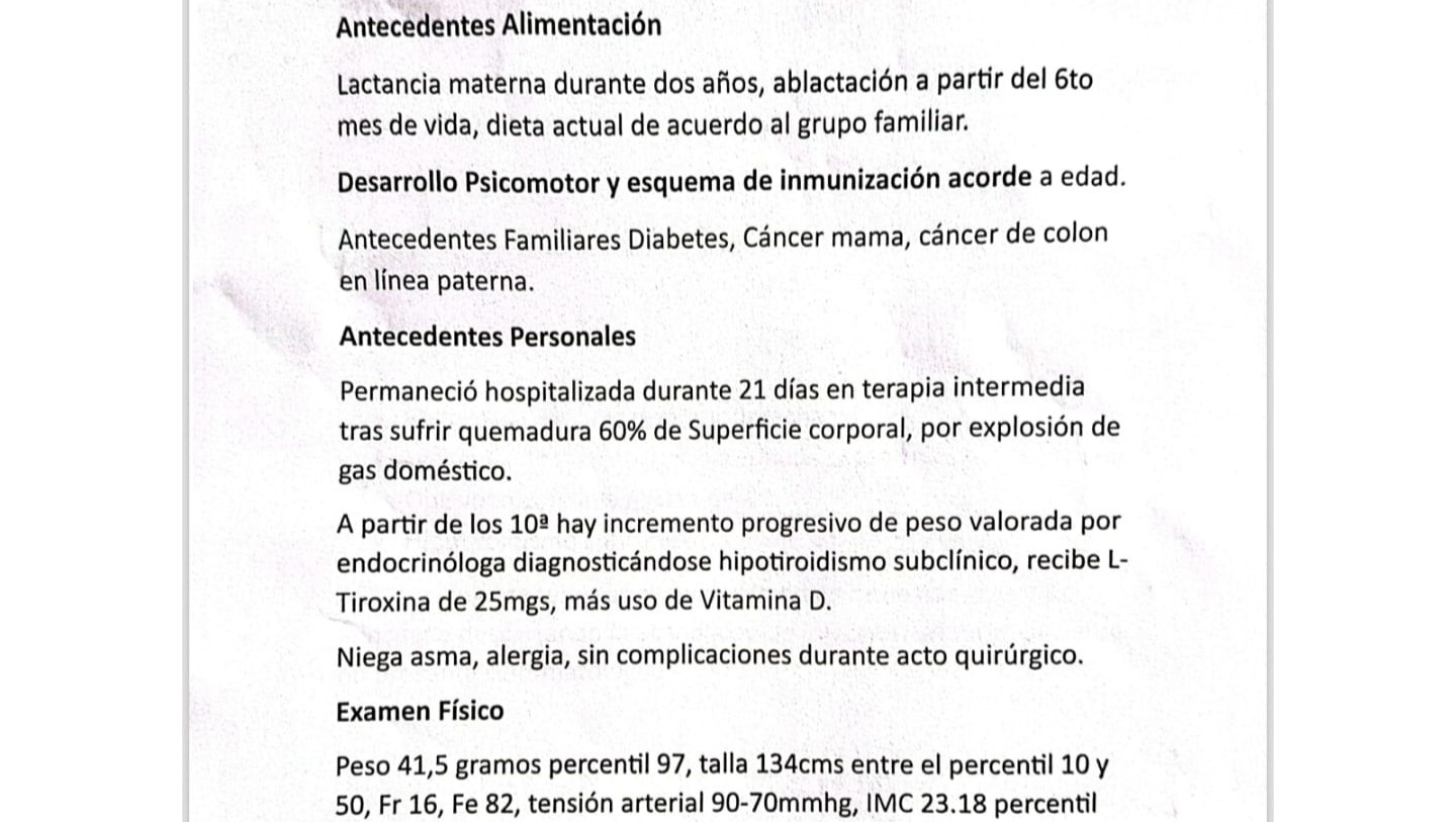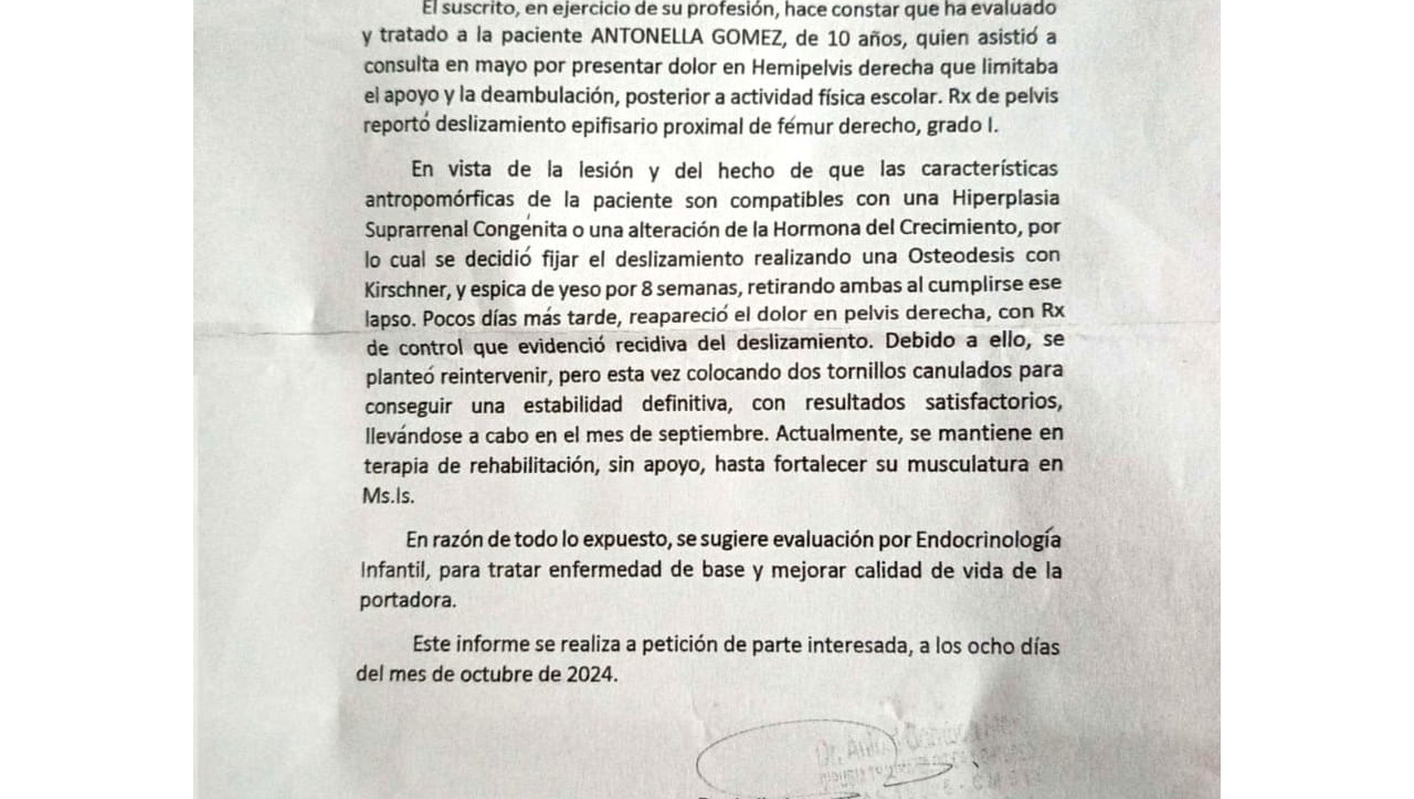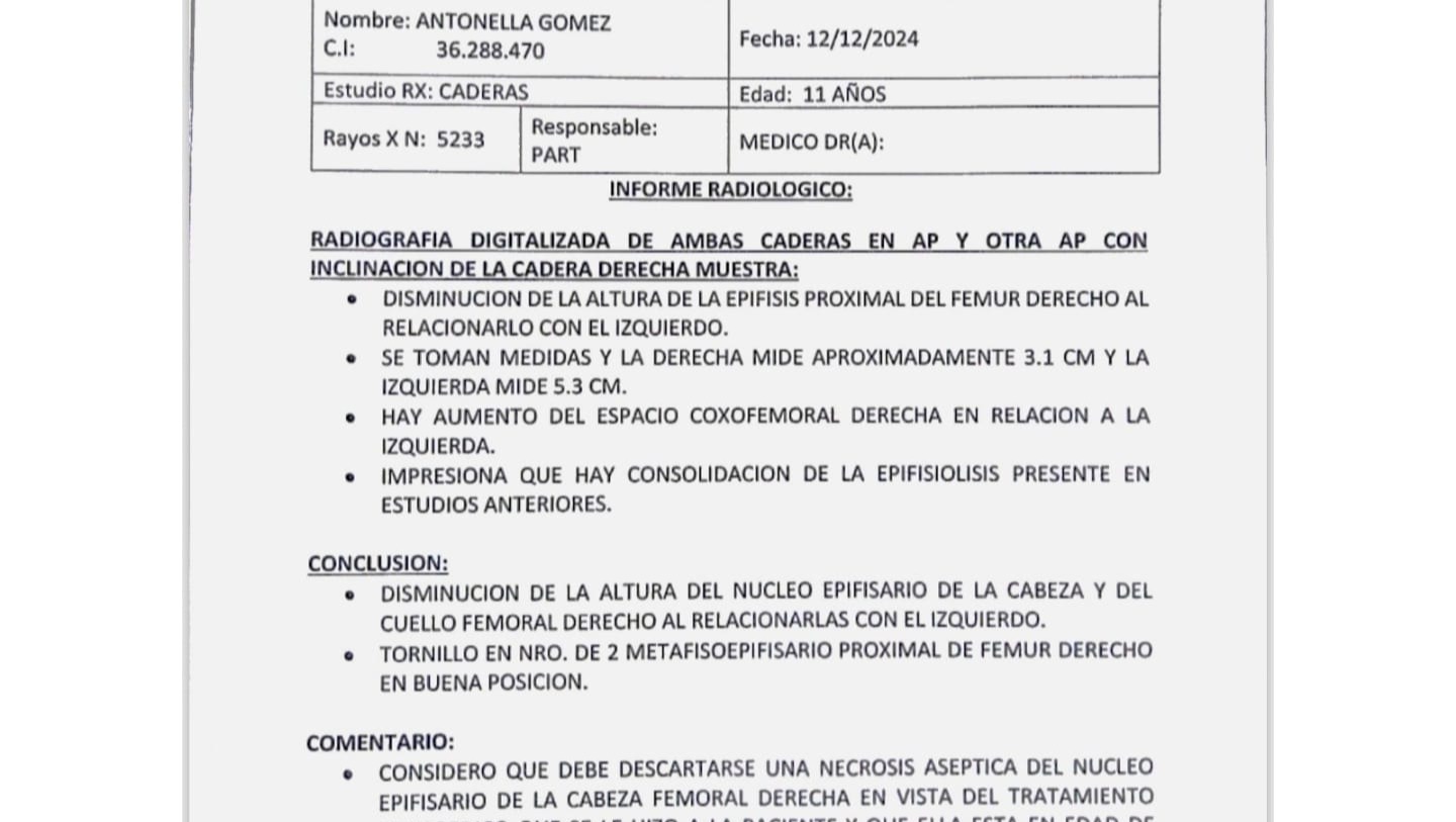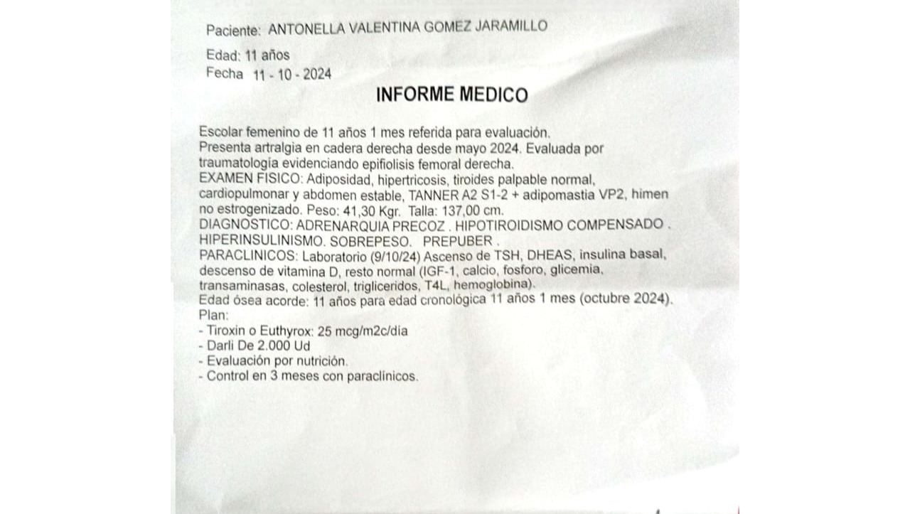 No es solo la cadera lo que Antonella enfrenta. Su diagnóstico también incluye condiciones como adrenarquia precoz, hipotiroidismo compensado e hiperinsulinismo, que requieren medicamentos diarios, evaluaciones constantes y un enfoque multidisciplinario en endocrinología pediátrica.