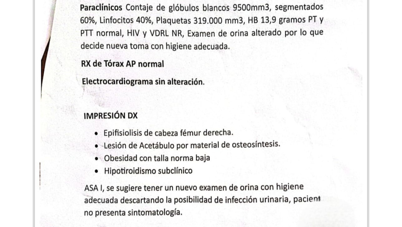 Sin embargo, su recuperación aún no ha terminado. Los médicos han indicado la necesidad de una tercera cirugía, ya que lamentablemente la cabeza femoral afectada sufrió una necrosis asintomática, lo que no solo generó un acortamiento de su pierna derecha, sino que también hizo que el material de soporte colocado en la última cirugía se desplazara, comprometiendo seriamente el acetábulo de su cadera. Esta nueva intervención es crucial para garantizar su estabilidad física y prevenir mayores complicaciones. El costo de esta cirugía asciende a USD 2.480, una suma que, sinceramente, no podemos asumir por nosotros mismos.