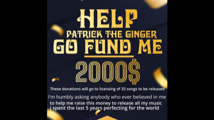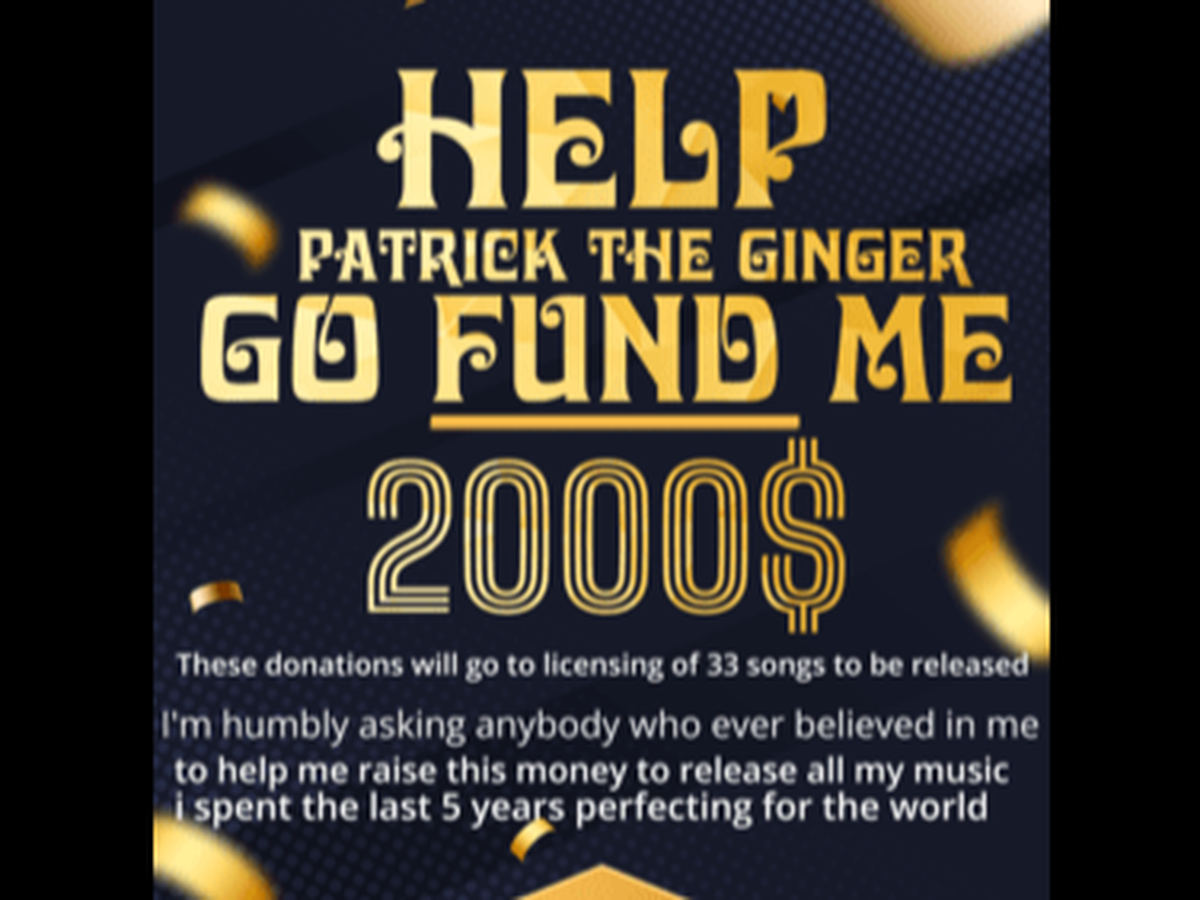 Hi my name is Patrick the Ginger. My main focus is to make music that if you live by it will change your life. I am a SInger Song Writer of many genres from phoenix arizona. I have spent the last 12 years really focusing and perfecting my musics lyrics and overall sound to be able to create somthing that has never been heard or done before. The reason im asking for help is because i need licensing before i can put out the 33 songs and its been hard for me to get the money in my current situation. I have invested every penny i have into this and i know when you hear it you will understand why its taken this long and why its so special. This means the world to me and i will not only never forget those who help me but i will never leave those behind. Thank you for taking the time to read this and never hesitate to reach out.