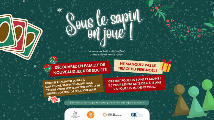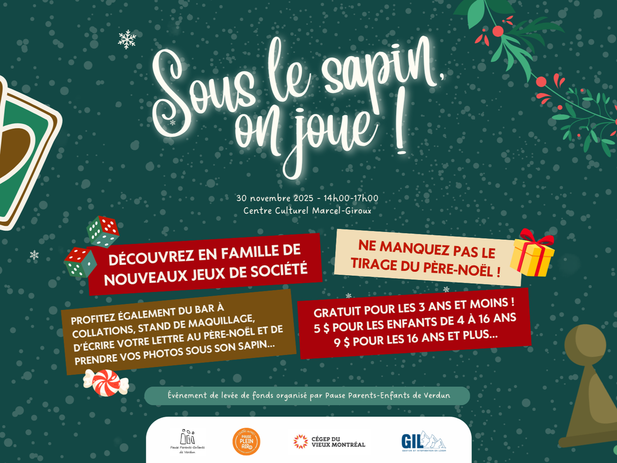 Plongez dans l'esprit festif de Noël en soutenant le projet "Sous le sapin, on joue!" à Montréal. Une équipe dynamique d'étudiants du cégep du Vieux Montréal en collaboration avec Pause Parents-Enfants de Verun Inc, organise un événement de collecte de fonds pour acquérir un vélo cargo. Aidez-nous à élargir nos activités de loisirs en offrant un moyen de transport écologique et pratique pour desservir un plus grand nombre de participants. Joignez-vous à nous pour rendre Noël encore plus joyeux et durable!