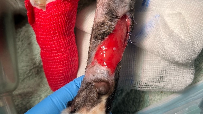Kevin was handed into a veterinary practice with a severe open leg wound that could not be stitched closed. Instead, intensive wound management was required to allow healthy tissue to regrow naturally - a slow and labour-intensive process with a high risk of infection and tissue death.