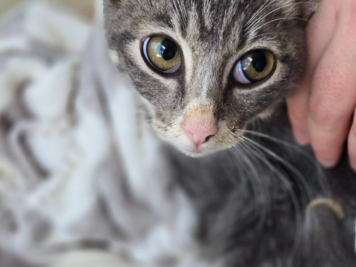 Hello friends! I'm Peggy. And I haven't had the best start to life, but this doesn't mean that life can't get sweeter from here on out! I'm approximately 12-weeks-old and my favorite things include: incessant purring, snuggles, staring dazingly into my "rescuers" eyes, and eating ALL of the things that you can offer me. -Peg! (Tentative name) ☠️