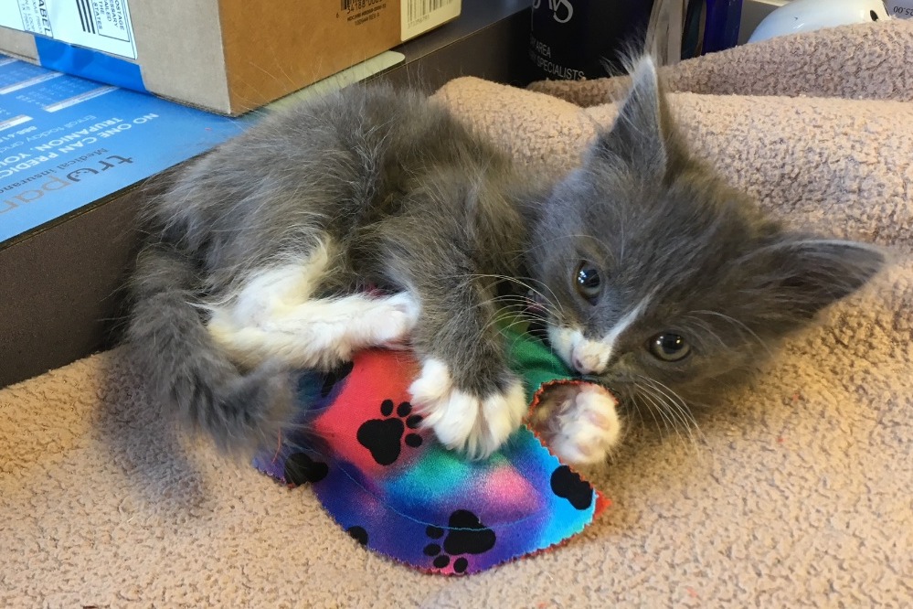 My moms have worked hard to help me stay alive. They feed me kitten food smoothies five times a day and they taught me to eat standing up so I don't throw up. I've been growing and learning to do all the normal things kittens do. One of my moms works at Alameda Pet Hospital (my other mommy is a school teacher) and I go to work with her everyday. The doctors there are really nice, keep me healthy, and even let me play in their office. All the staff takes amazing care of me and always plays with me and brings me toys. My moms always remind me I should be really grateful to have so many friends.