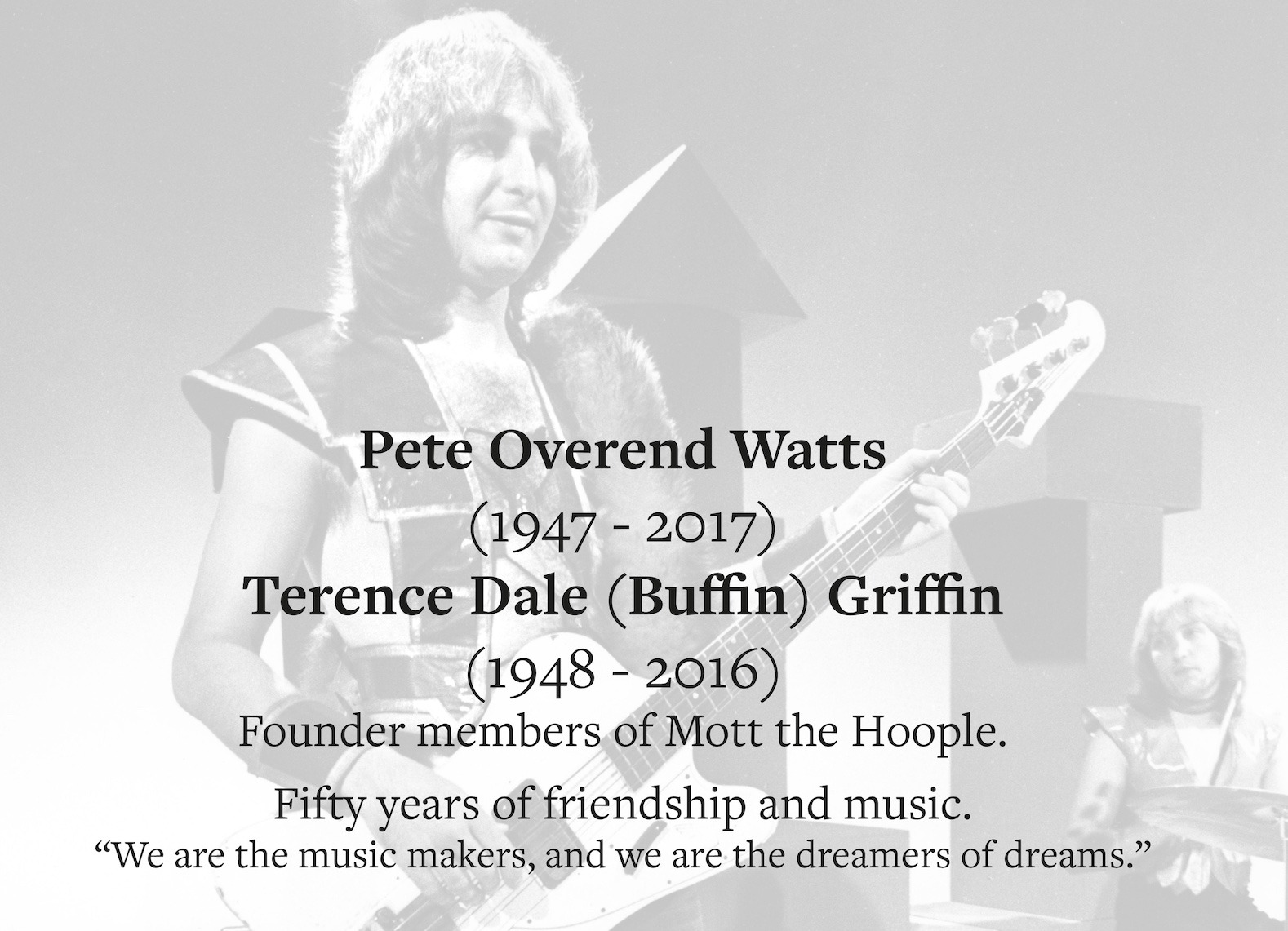 Pete and Buff were founder members of Mott the Hoople. They were there at the start and provided the powerhouse rhythm section throughout the life of the band, as well as the subsequent incarnations: Mott and British Lions.
