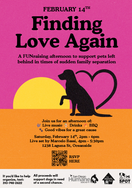 I’m organizing this event next Saturday at my place in South Oceanside, to raise funds and awareness for abandoned pets in the wake of immigration enforcement. Shelters were already over capacity, and this is an ongoing crisis that is just going to get worse.