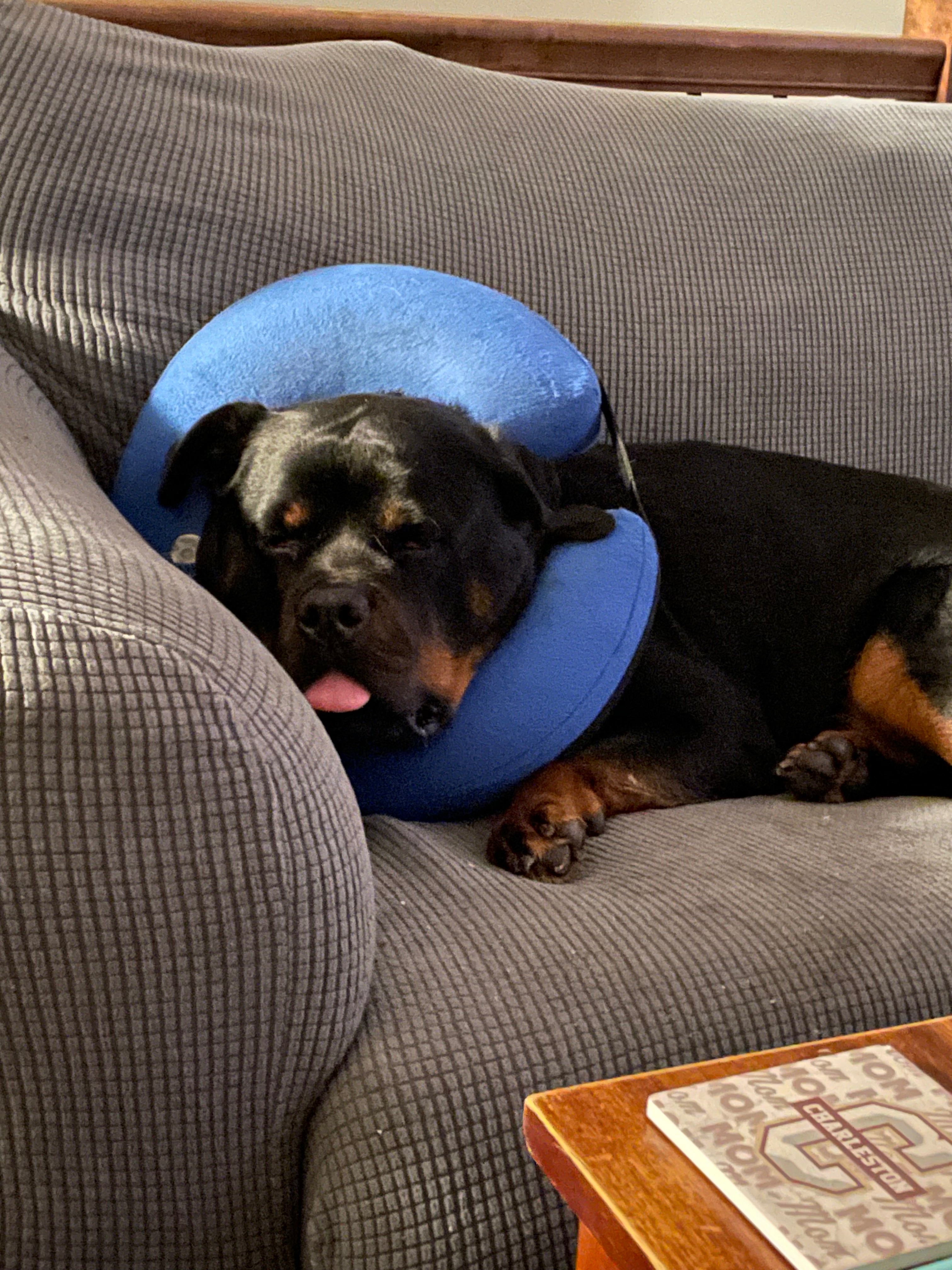 Raven is usually a very active, happy dog, but for the past two months she’s had to wear an inflatable cone to prevent her from aggravating her tail, which has been incredibly difficult for her.