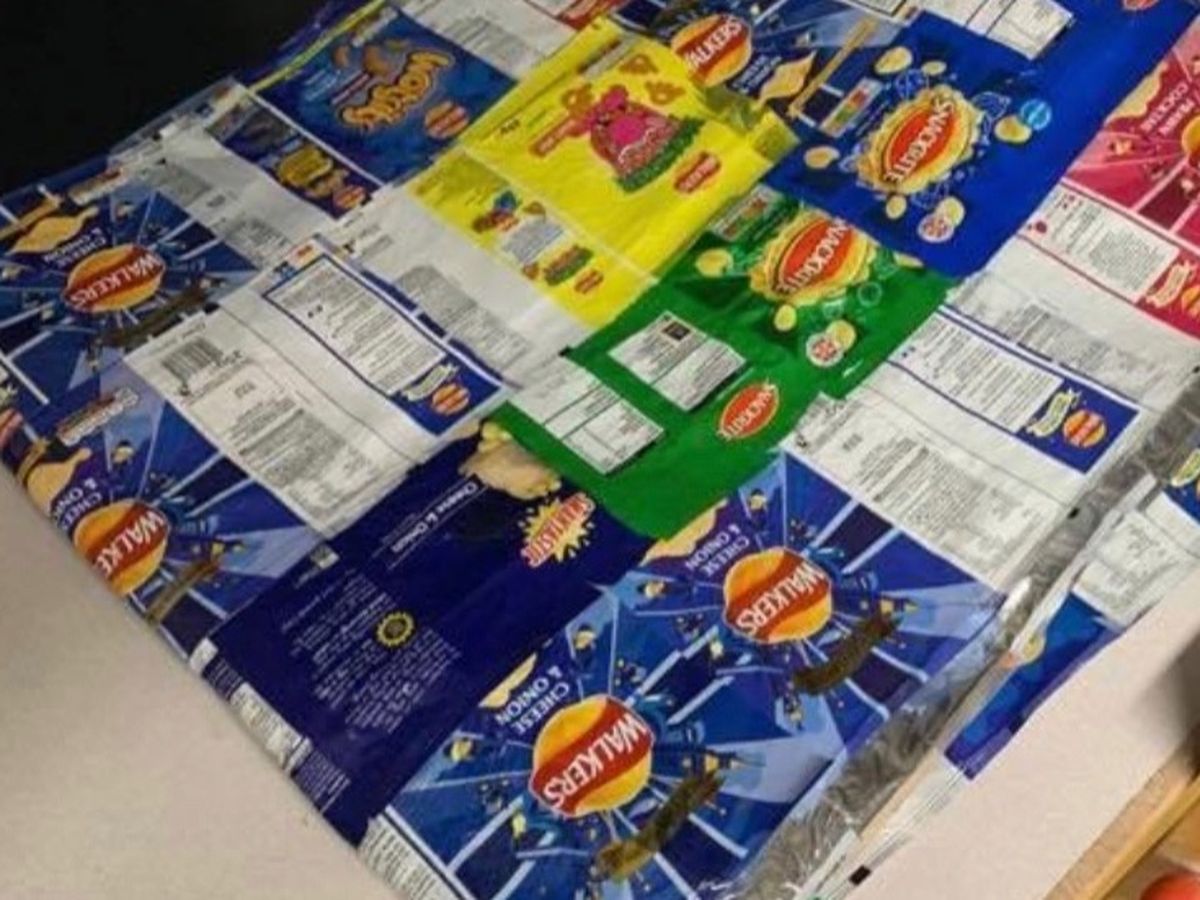 My Mum & her colleagues have been making recycled blankets for the homeless out of used crisp packets. They are made by using foiled crisp packets and then a layer of plastic sheeting is applied over the top once the packets have been ‘ironed’ together.