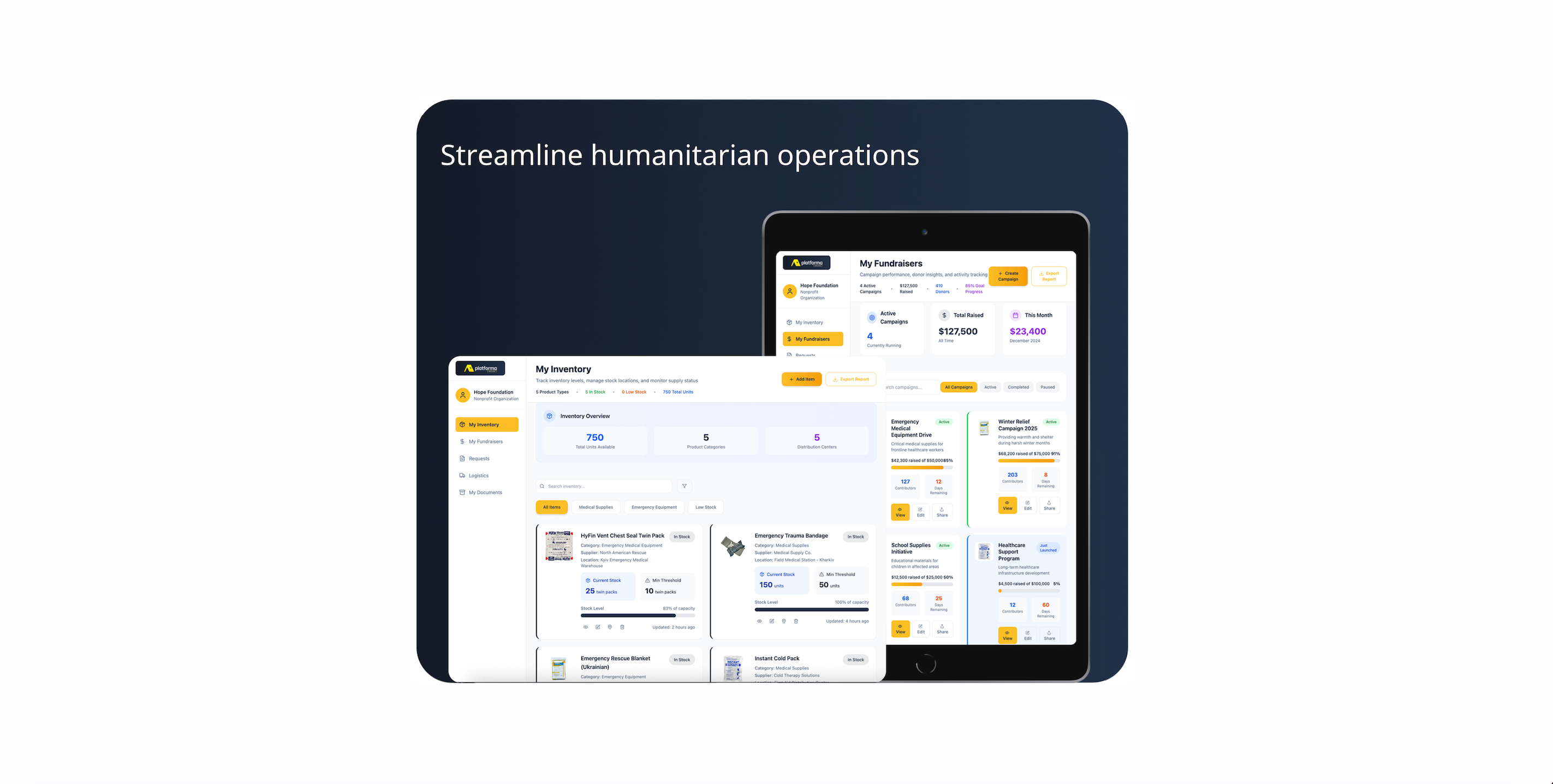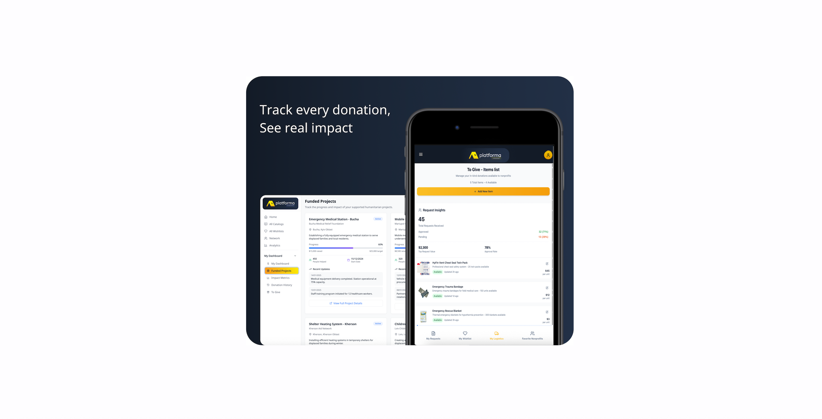 Platforma is the first comprehensive digital logistics platform built specifically for humanitarian aid. We connect nonprofits, recipients, donors, and suppliers in one trusted space where recipients can request specific aid where and when it's needed with minimal intermediaries.