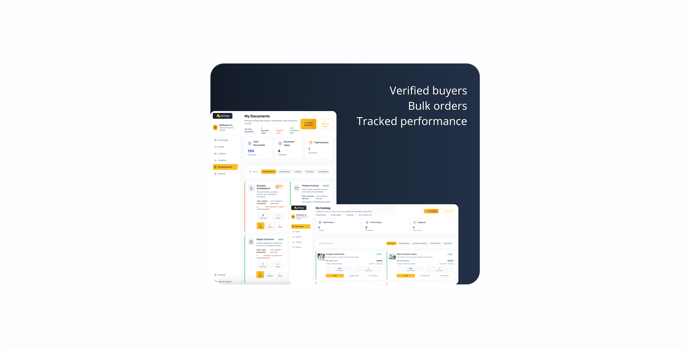 - Suppliers connect directly with verified humanitarian organizations through our marketplace