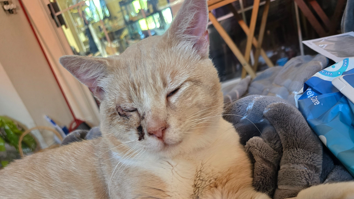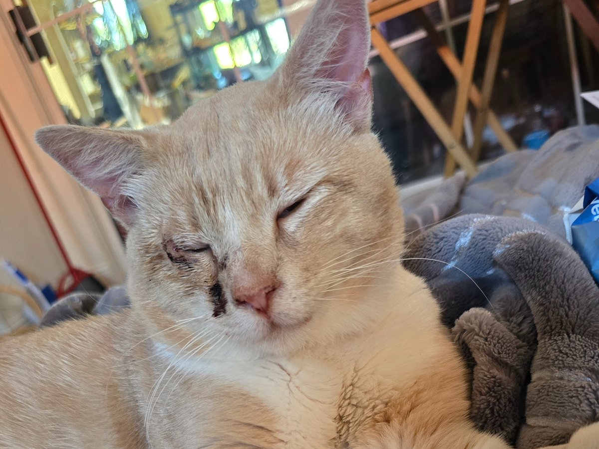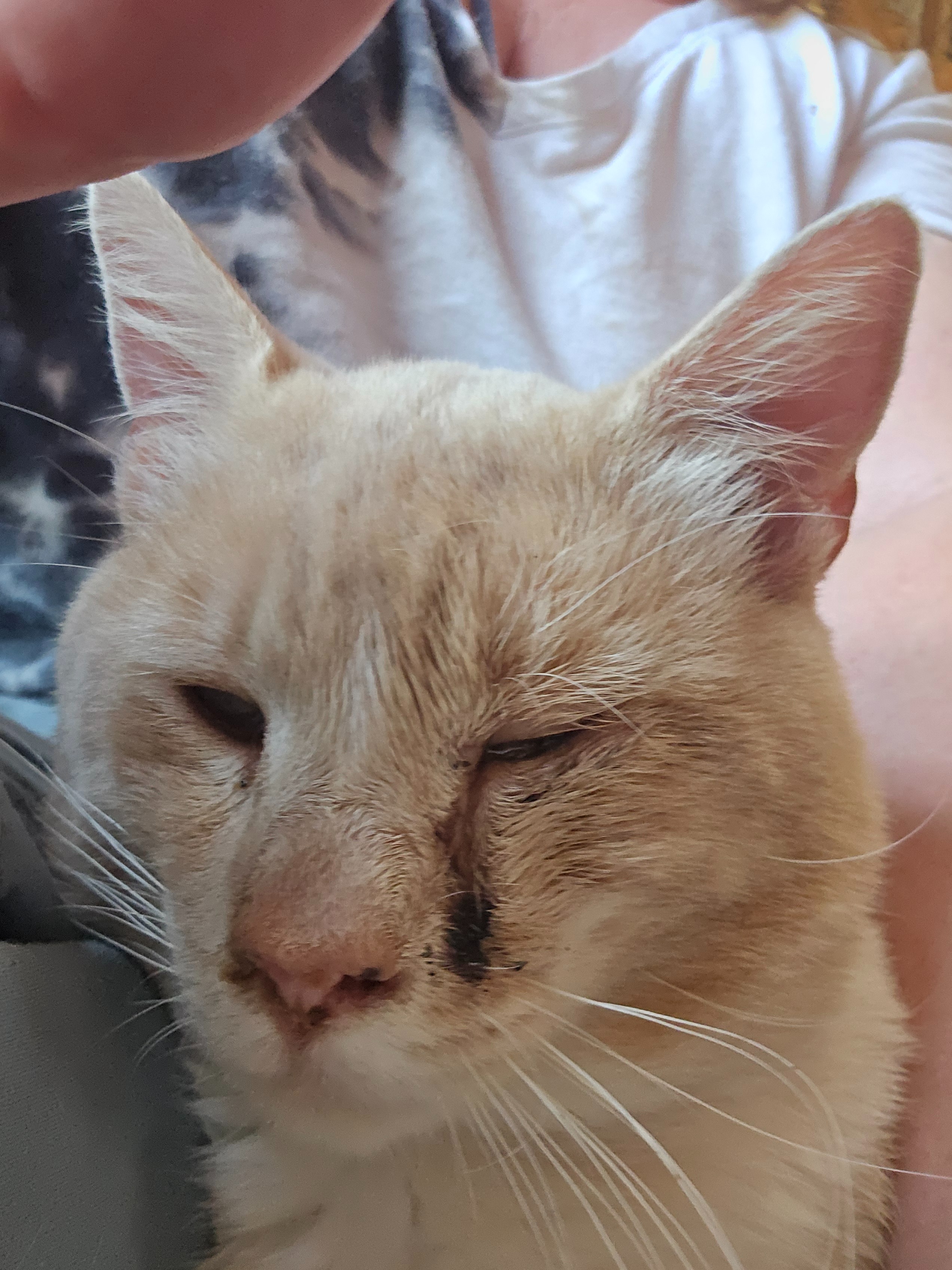 The vet also looked at his oddly shaped, very runny right eye. He believes someone tried to force it open as a kitten, injuring the eyelid. The vet is going to make an incision on the outer corner of his eye to hopefully alleviate the constant irritation his lower eyelid is causing.